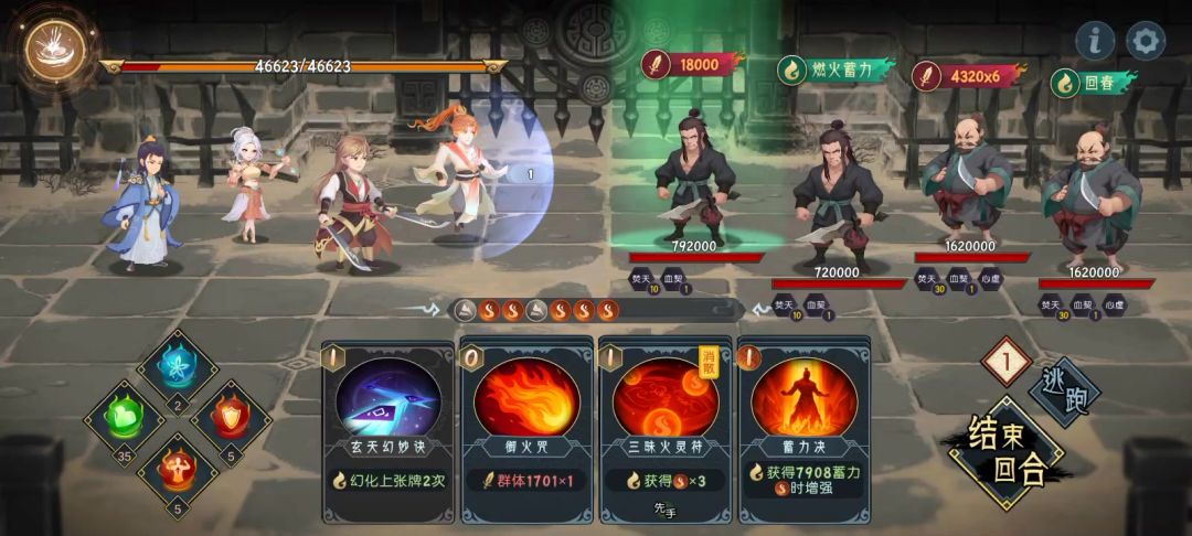 前面的解除玄机道人封印的左右两边焚天教修士没录上。思路和这个是一样的。前两回合叠加战意,在第二回合解决小怪,需要第二回合结束前和第三回合攻击前磕药。 1.吕风和烈阳以法力为主,需要第三回合叠加蓄力。 2.邓灼月全攻击。我带的6级怒火,5级终焰 3.炎羽随意。 4.毕竟等级低对灵力要求有点苛刻,第一回合最好能将战意提高到380层左右。第二个回合加个200多。第三回合复制蓄力提高蓄力直接冲就完了。