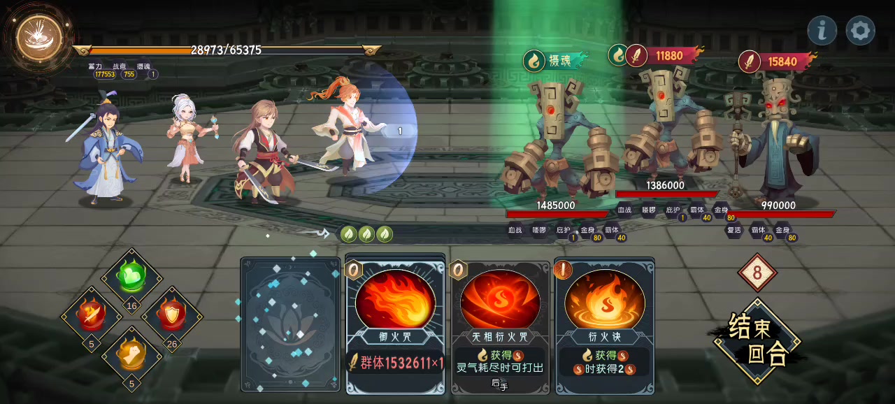 #机关要塞 阵容要求: 吕风+邓灼月+炎羽+烈阳尊圣 吕风带血量装 邓灼月攻击装 炎羽和烈阳尊圣带法力装,炎羽要有一个凝符 法宝刚需火蛇印,可以增加40%战意值 第一回合,保证邓灼月先打出御火咒,再释放其他角色的蓄能牌,防止消耗蓄能。吕风复制炎羽三昧火灵符,所有人把加火灵气的牌打完,炎羽的万灵聚力咒捏手里不要放,烈阳尊圣的蓄力牌打出,最后释放烈阳尊圣的燃灵战意决,可以得到400+战意,战意低于这