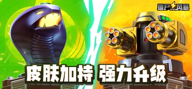 随着各种僵尸的越来越强,我们增强了我们的一些塔,使他们变成了更加强力的作战武器,给他们添加了一层高科技皮肤,接下来就介绍一下我们本周带来的两个新皮肤~ 皮肤介绍 1.火焰蛇 合作模式:被击中后,有5%几率引燃地块;该格子上的塔附带10%火焰伤害,可引燃黑油喷射弹; 竞技模式:被蛇击中后,有5%几率腐蚀地块;每隔10秒使格子上的塔点数-1,最低到1级。 2.狂暴加特林 每攻击20次,对200