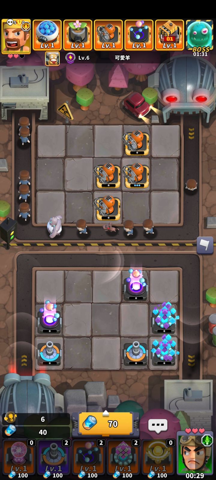 输出方:核心13-15级诸葛连弩,15级音响,15级锯子,15级反应堆,14-15级阿尔法,角色带15级队长辅助方:14-15级黑客,14-15仿生蛇,13-15暴风雪,13-15重构,13-15复制,角色带13-15级博士输出摆法就是三反应堆,两音响,两锯子,一暴风雪,七诸葛连弩辅助刀满以后看时机放角色技能,期间暴风雪不能断,双方塔等级和强化均不满的情况下可以通关1000+,反应堆满和
