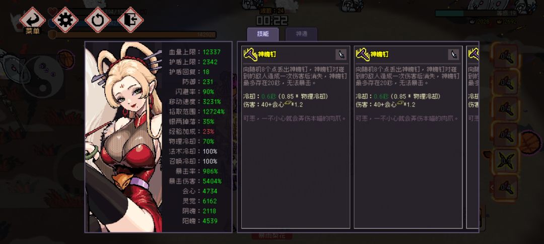 快速把七天奖励给领完,然后直接购买胡媚娘,然后拿桃子换天赋点,觉醒银元天赋。进入之后买一个技能,断网,你就可以无限刷技能了 直接直接一个金色的针,其他全是钉子,然后站在原地不停献祭就可以分屏刷视频了。 最后就可以拿胡媚娘刷所有角色,和桃子。 我封面那个是属性刷满了,无聊试一下其他的技能,这边还是推荐钉子,是真的好用!!!!