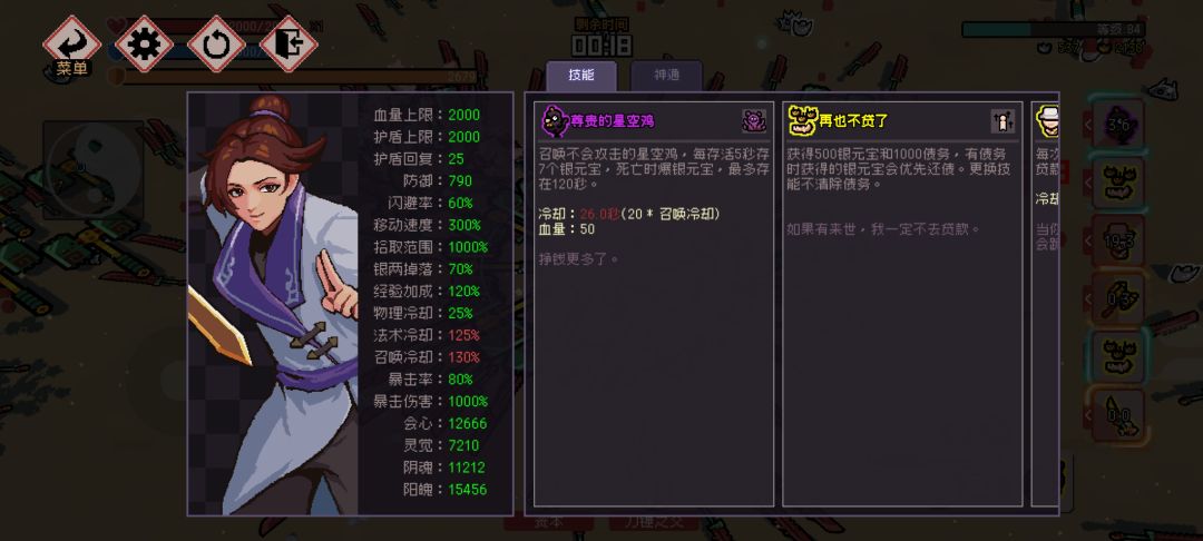 一.开局不点技能攒22银元宝,直接用元宝刷贷款和鸡,运气好开局几百银元宝,推荐紫色优先跑着拿钱,前几个boss拿金元宝 二.25%物理冷却,3寻花步,1毒气瓶(不占冷却技能都行),太上金丹和金骰子,刷个几十复活就可以把太上金丹换寻花步了 三.25%物理冷却,3悟道指,1刷新,1金丹,1骰子,这个套路相比上个套路阴魂快好几倍,缺点就是没有暴击,后期可以把金丹和骰子换成加护盾的柱子和镇魂纱 四.法术套