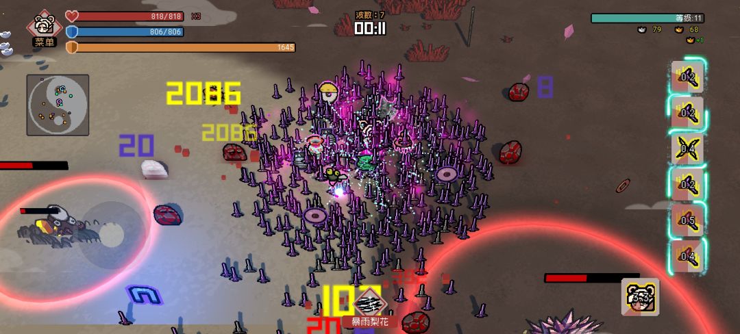 无尽刷怪很快不能像普通模式慢慢运营,开始小鬼+聚宝盆刷钱,兔子组合快速刷金矿和银矿顺便用被动献祭增加基础属性,在加上锤子+飞刀增加生存率,顺便打输出冷却快,没事就看看货郎里面有没有蓝色、紫色的技能,3-4波左右就可以把兔子组合通过货郎换掉,最好是紫色技能,就可以换陨石+喷火回血回盾,把锤子和飞刀升到蓝色或者紫色,现在不站桩生存拉满,矿提供的经济可以代替小鬼组合就换金色的梨花针,可以用来献祭提升基础