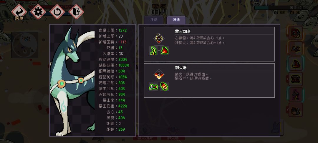 先说我怎么玩的,狗子一开始出来马上用技能大吃特吃[表情_斜眼笑]然后前面最好技能有闪电链,走路拿金元宝必有,吸血也要一个,先把神通御火盾拿到,然后主升陨石技能,先升到紫拿流星雨(物理)然后再升喷火或是把另一个神通技能凑到
