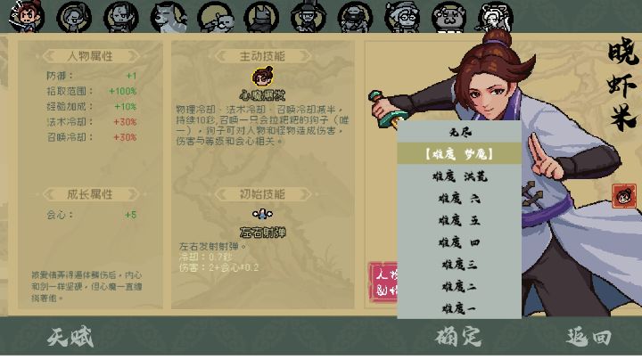 前言: 各位请注意了,这里不是放牛班的春天,这里是大型国产肉鸽生存挑战通神榜的游戏界面!想在游戏里放牛?来,我教你啊! 背景: 游戏界面非常简单,天赋升级只有一页纸,结构还很清晰,新玩家首轮进入游戏带不了天赋,从图鉴里我们可以看到基本的技能,神通,角色,还有各类怪物,看着也都挺呆的,好了,闲言少叙。 故事背景: 我们这位名为小虾米的少年要进入战斗界面了,难度选择最低,我来给各位讲一下背景,书说纷纭