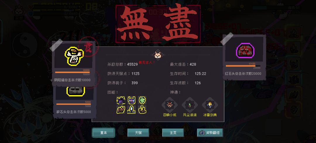 无尽刷怪很快不能像普通模式慢慢运营,开始小鬼+聚宝盆刷钱,兔子组合快速刷金矿和银矿顺便用被动献祭增加基础属性,在加上锤子+飞刀增加生存率,顺便打输出冷却快,没事就看看货郎里面有没有蓝色、紫色的技能,3-4波左右就可以把兔子组合通过货郎换掉,最好是紫色技能,就可以换陨石+喷火回血回盾,把锤子和飞刀升到蓝色或者紫色,现在不站桩生存拉满,矿提供的经济可以代替小鬼组合就换金色的梨花针,可以用来献祭提升基础