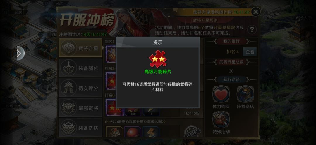 1.开区最重要的是等级,等级越高功能就越多,可提升战力的方式也就越多!(23级开装备副本,27 级开侍女)开区当天有月卡的情况下等级可以到22级左右战斗力100W。有能力的新区一定要关羽开局!400%暴击,带真实伤害击杀敌人可继续攻击。