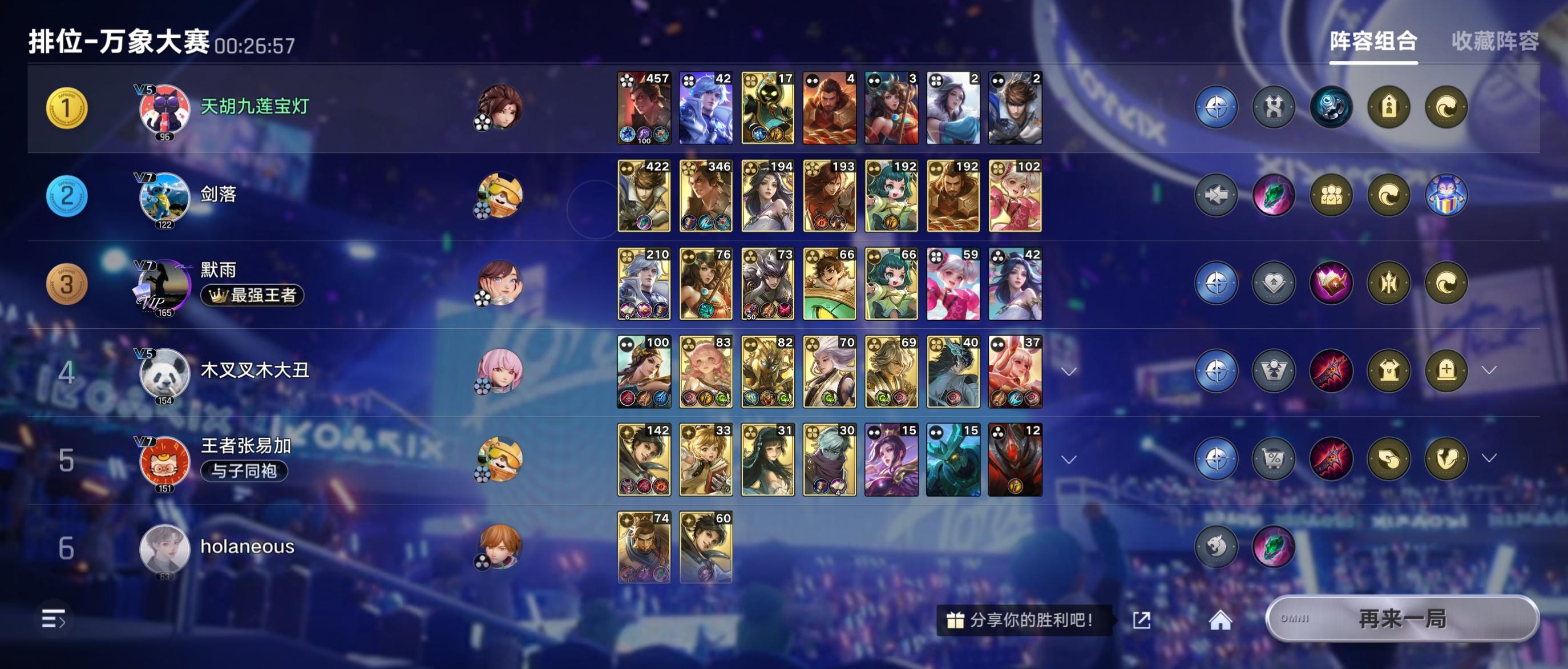 闲的没事打了一局特殊训练,一不小心开启了庄周配白哥的无限循环,一个回合二十多分钟都没出完牌,单回合升了四百多级都完不了真的要命。。。要不是碰上更新强制退出来,真不知道什么时候到头。。。这要是排位赛的话,也就能打几十张牌吧,其余全浪费了简单来说牌主要有几个来源:一是庄周上场就能给张招募牌。二是白哥技能上场四个随机送一张场上英雄。三是场边上有小