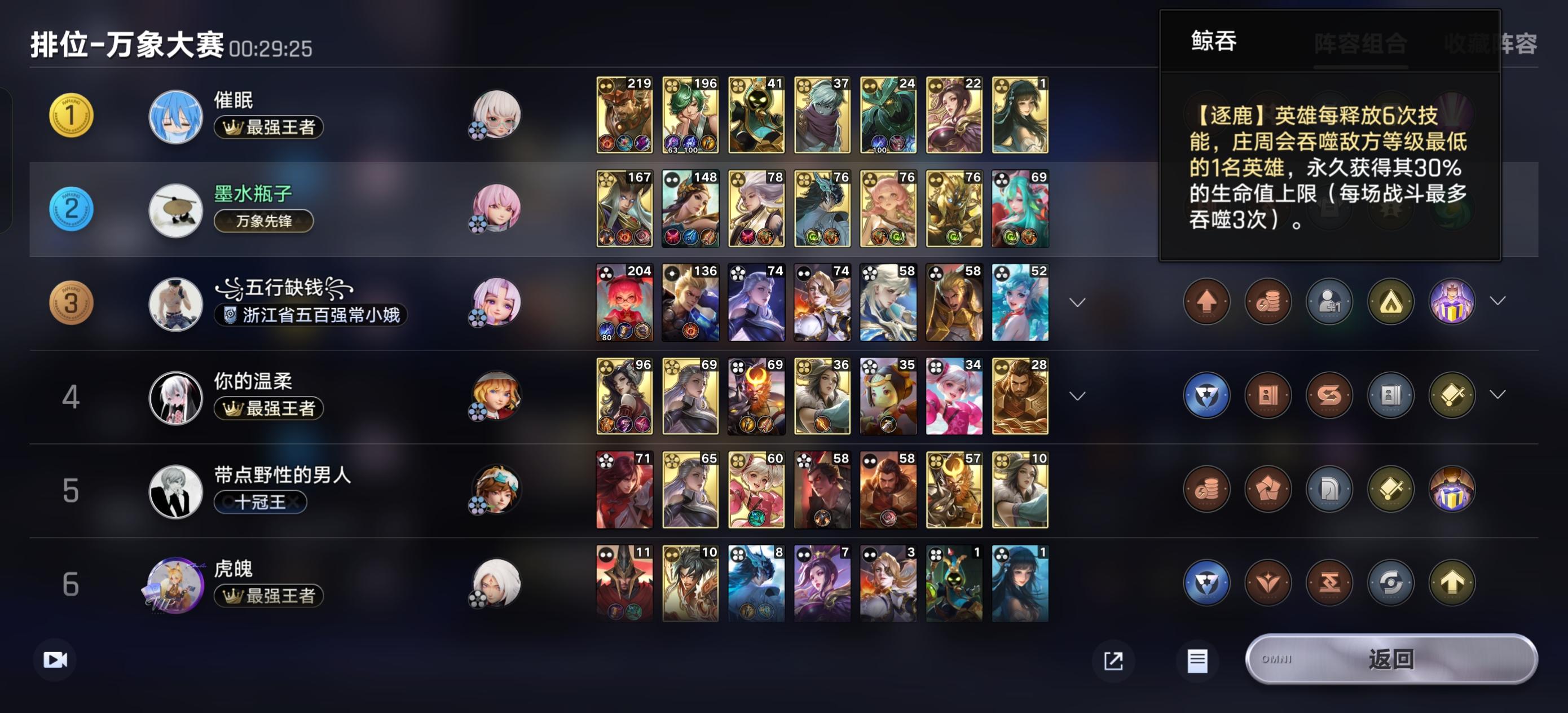 所以棋手都玩过了,现在都整随机英雄,棋手跟阵容强度息息相关。只要不禁三分、日落海倒转目前算是最强一档。很多人说我5阶卡打不过1阶的耀天帝,其实这就是跟其他自走棋不一样的特色,费用都是3费,只不过逐鹿有个特点就是养大哥,其他棋子等级很难起来,但也比较好针对,装备特别重要,优先选和合成沉默、制裁、眩晕。这游戏也是个养大哥的游戏,针对他们大哥选择棋子也很重要,河洛的钟馗能降等级,决赛圈最好用的棋子,还