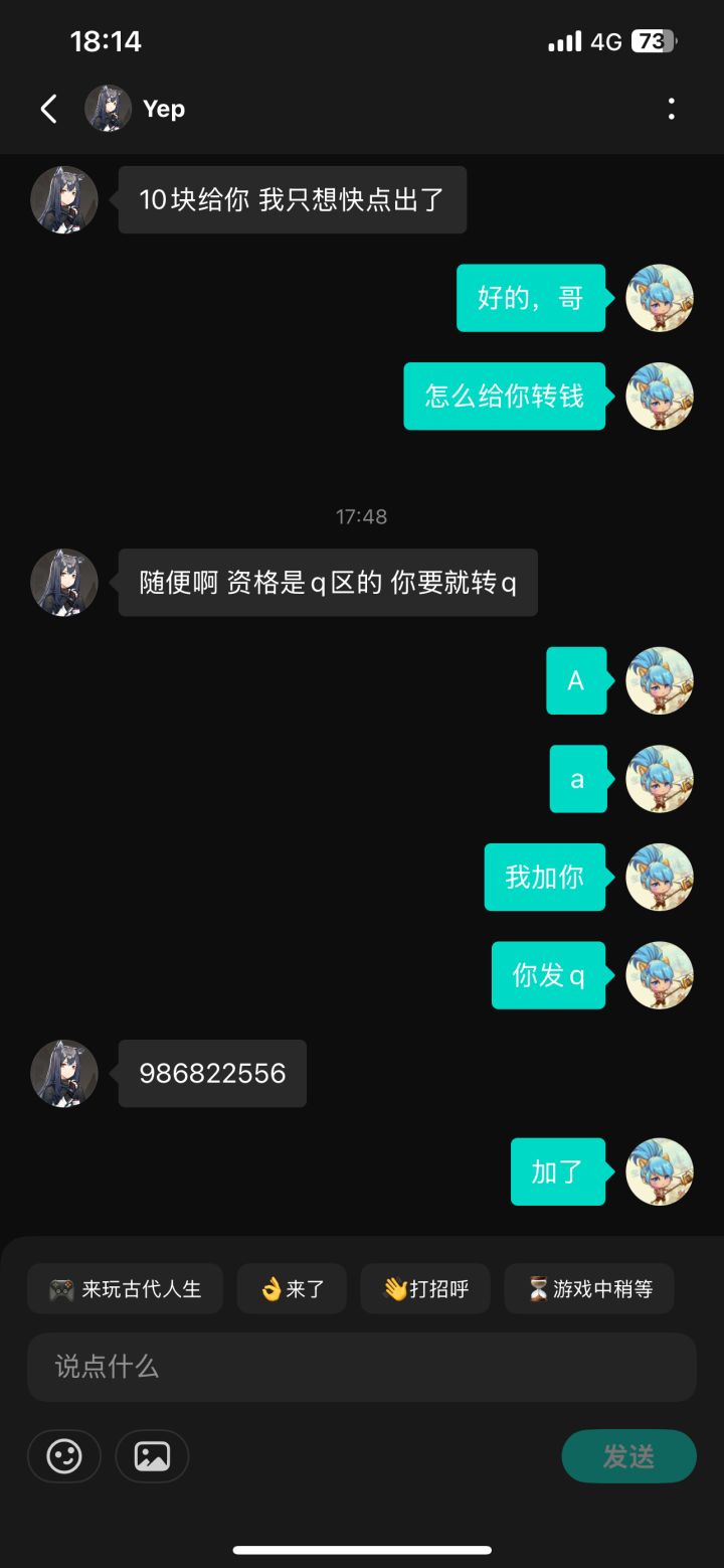 想买个万象棋资格,结果让骗了10块钱,大家注意不要让这个人骗了,估计骗子挺多