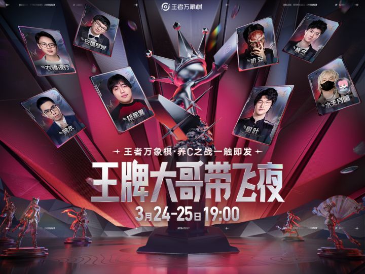 王者英雄新爽局,群星养 C 竞大哥!《王者万象棋》「王牌大哥带飞夜」全明星阵容震撼首发!八大王牌主播竞逐大哥席位,更有顶级教练团全程助阵,到底谁是真大哥,谁是全场挂件? 3月24日(周二)19:00,炸场开播桃黑黑&阿水争夺万象棋坠强大脑安德罗妮&衣锦夜行策略双神正面 battle 3月25日(周三)19:00,欢乐加码万象棋老手树叶迎战牌佬顶流水无月菌听安&桑杰猴王争霸勇闯养大