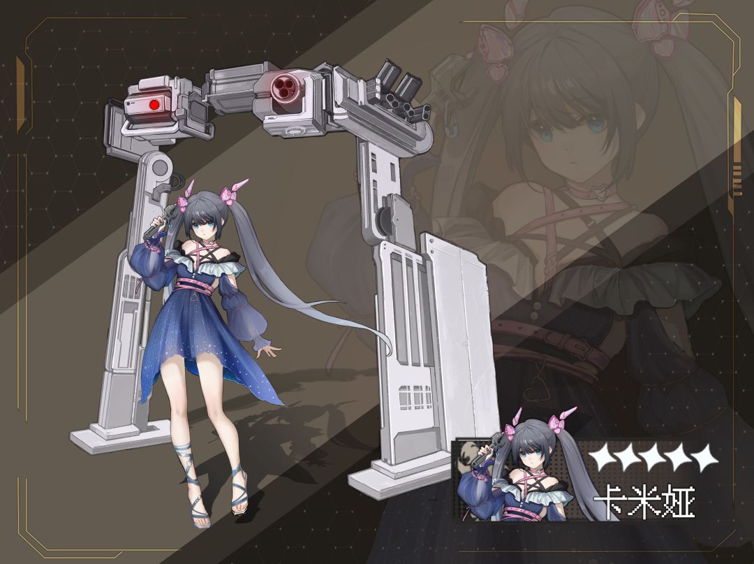 经过紧张的筹备,新角色卡米娅就要跟大家见面啦! 【卡米娅・智械天使】 精于机械构造设计的卡米娅为她的智械设计了危险的爆破能量武器与开放式修复组合系统,这使她的智械可以利用就地取材的组件不断提高战斗力与结构强度,当智械降临战场时,所有敌人都将面对“智械天使”带来的精巧毁灭。 卡米娅是操控智械“门框”的工程师,在游戏进程中,门框会跟随卡米娅一同抵达战场,辅助攻击敌人,当受到无法承受的攻击时,门框会