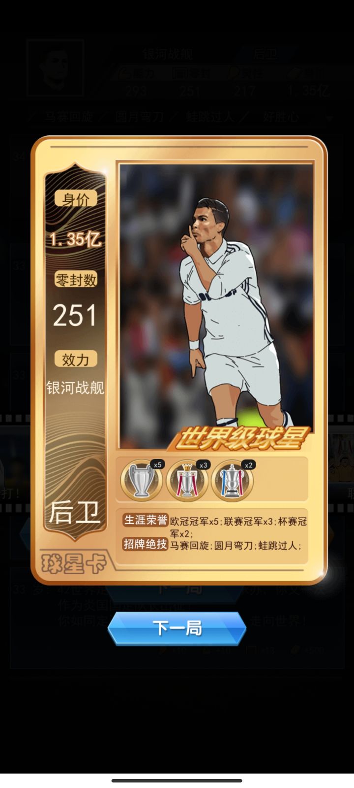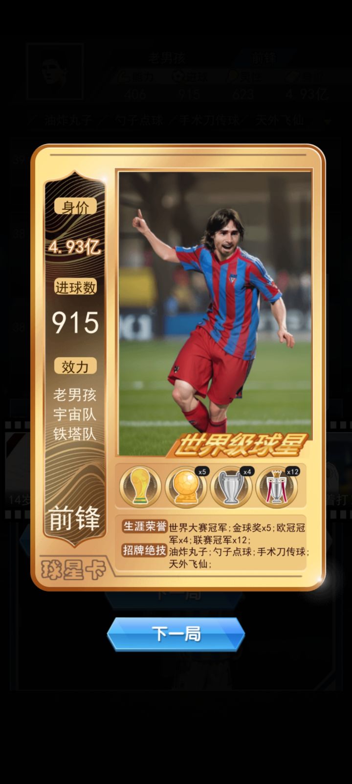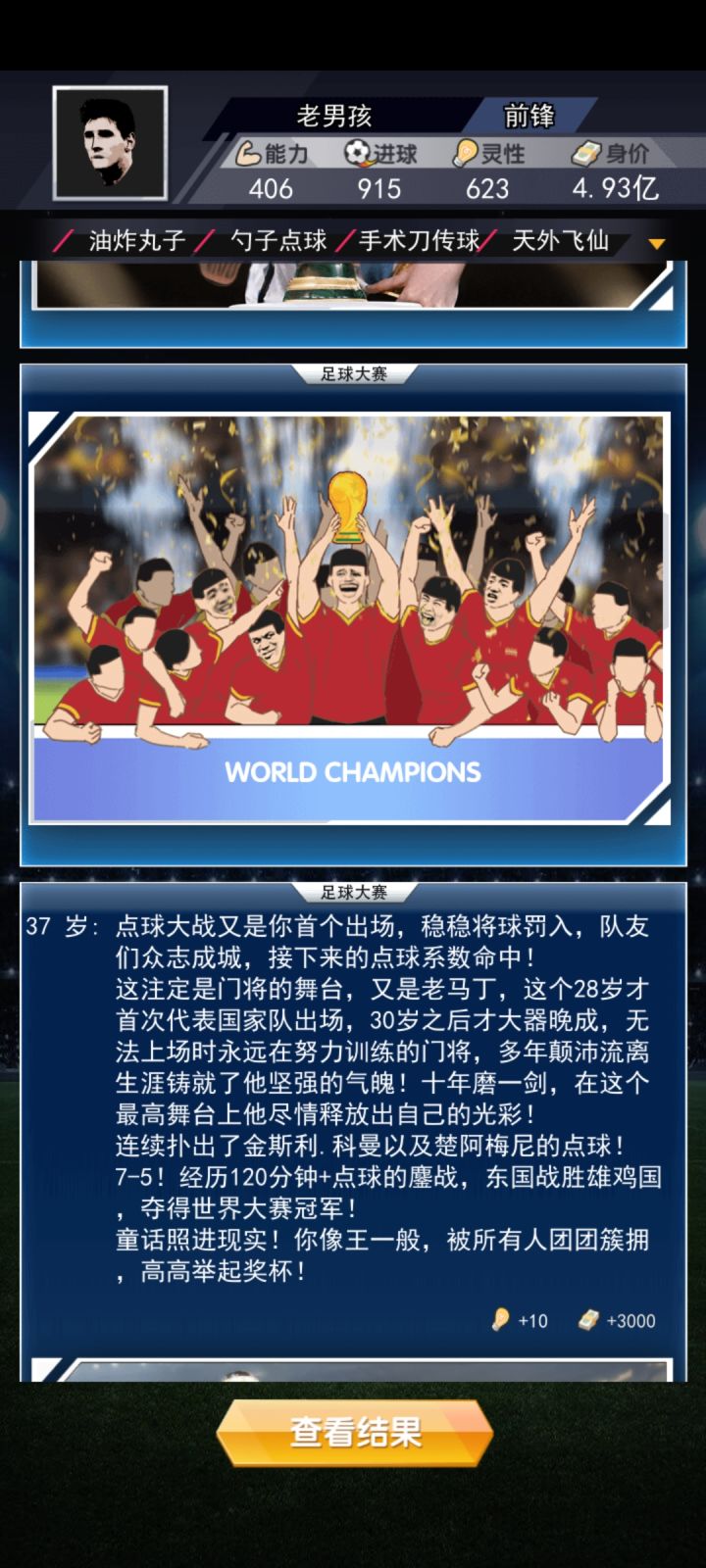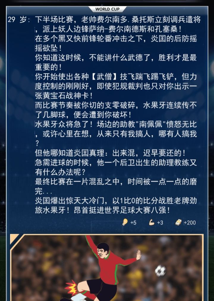 小技巧(个人总结,不一定严谨)这个游戏的关键是36技,只有有足够的36且恰好用得上的技能才能在世界杯走的更远。位置推荐中场,能学的技能多。只要有机会尽量转会,才能多学到技能。前期被大黄蜂选中就去(学技能),中期选俱乐部尽量去球星多出名的俱乐部,学技能的可能性大(比如说银河战舰)不仅是世界杯成绩,如果一直待在一个俱乐部很容易球队变弱了俱乐部成绩也刷不起来。第一届不可能进淘汰赛,第三届就是最强最有机会的了目前我的最好成绩半决赛,过程如下(天外飞仙和武僧真实用😍)