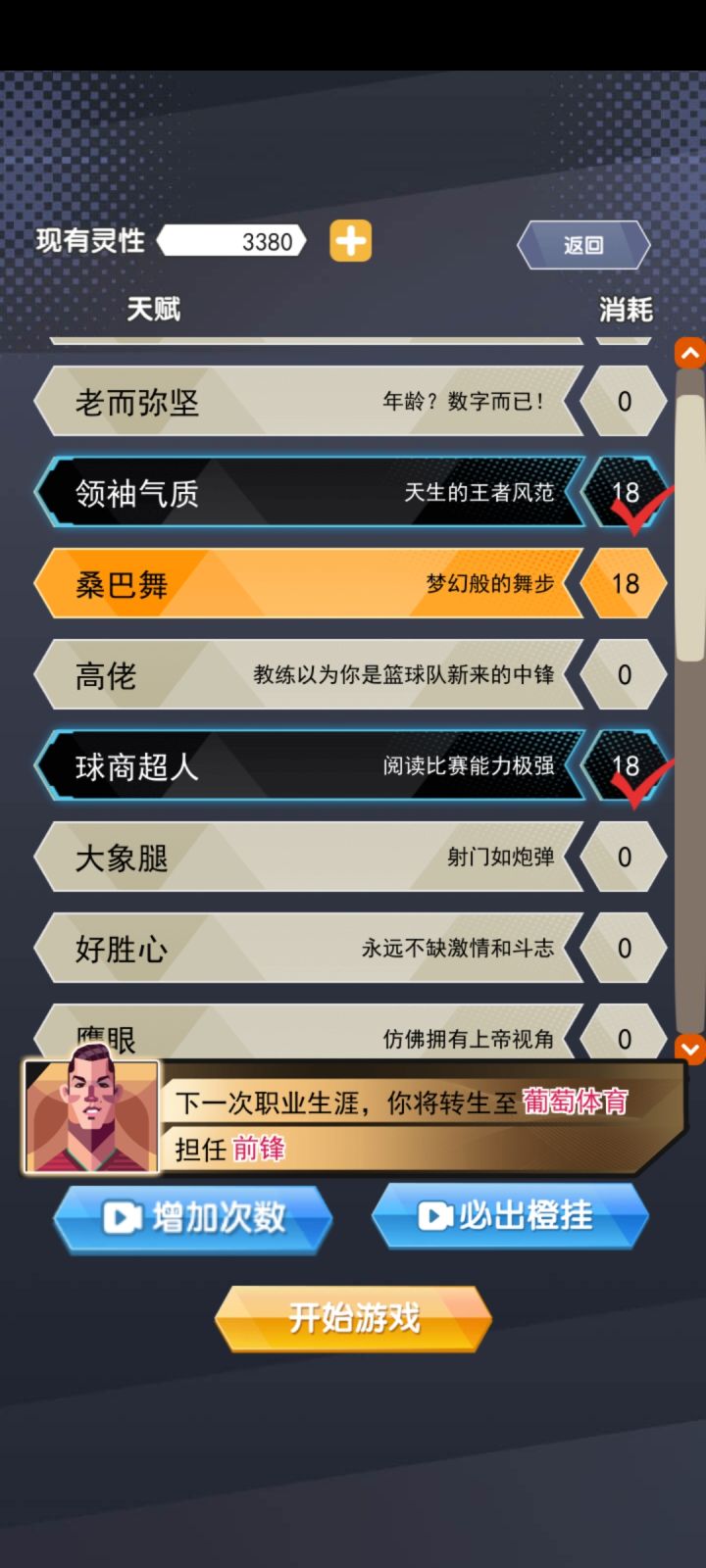 1.我的思路是多用天赋而刚开始用天赋实在太昂贵了。所以先把那个天赋减灵感的那一个点上然后再升那个灵感触发概率2.多去那些传奇名宿在的球队比如说皇萨仁米尤。几乎每局必学天外飞仙,电梯球(测试了一会貌似特技才对世界杯有效)3.希望制作组日后能改进一下各种天赋,比如说钻石和强壮有这两个天赋可以延长游戏时间现在的球员34岁以后其实还在踢。各种天赋加俱乐部可以出奇特的特技比如说香蕉球加直挂死角加皇马或红