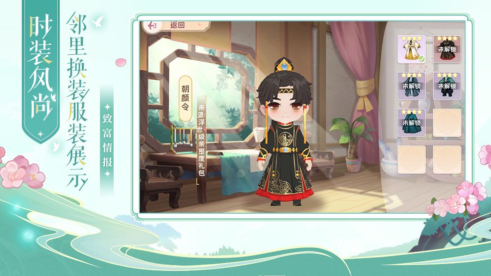 各位小富婆们好!小牧带着最新的爆料内容来喽!本次我将为大家展示邻里换装中人物浮世的时装,需要提升与浮世的亲密度等级才可获得哦~ 时装【朝颜令】 一身墨衣,搭配金色的织锦,华贵大气。发冠和腰带装点着一颗水蓝色宝石,气度不凡。 时装【夙夜为谋】 一袭青衫,头插玉簪,神情文雅,温润如玉。 时装【青云】 身着便衣,发冠梳起散乱的头发,衬得少年意气风发。 时装【墨韵】 一身青衣,头戴冠玉,君子翩翩,儒雅知礼
