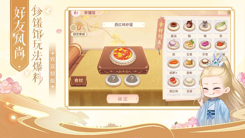 亲爱的小富婆们好呀!小牧又带着最新的爆料内容来喽!本次我将为大家介绍珍馐馆的玩法。 在珍馐馆中,小富婆们需要先进行菜品研究,根据菜名以及菜品样式猜测所需的食材。研究成功即可获得厨艺值。 研究成功的菜品可以进行烹饪制作,在规定时间内将食物依次投入锅中,按照正确顺序投入后将得到一份美味佳肴,并获得厨艺值。 通过累计厨艺值可提升自身厨艺等级,获得厨艺技能。 以上就是本期全部内容,小牧后续还会为小富婆们带