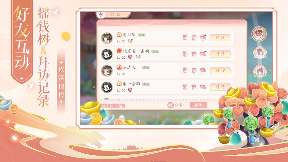 亲爱的小富婆们好呀!小牧来为大家带来激动人心的爆料内容啦!本次我将为大家揭秘摇钱树&拜访记录的相关内容!想致富,先种树!庄园新增种植物——摇钱树。将摇钱树种下,等待一段时间成熟后会产生通用货币。 通过养殖还可以提升摇钱树产出的收益。摇钱树的形态进化后,还会产出更多的货币收益。 摇钱树在成熟后,好友可通过拜访来到庄园,进行摇树获取收益。被摇过后的摇钱树收益会下降,但也会触发不同的随机事件,可能会有意