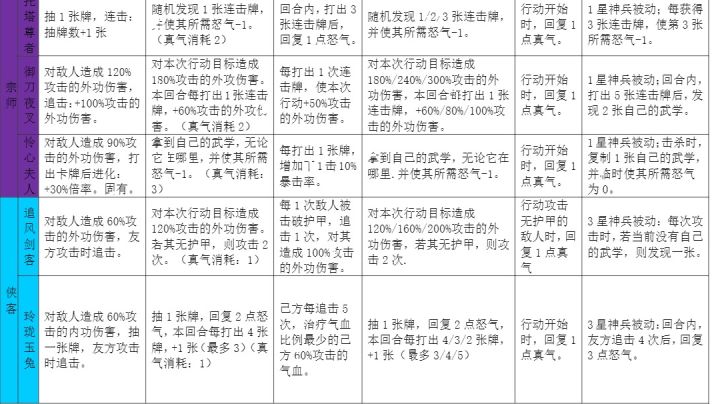 ①追风刺客:作为我们大家最喜欢的主角师姐,试问谁可以拒绝这样厉害又强大的师姐呢?师姐的1星武学是队友攻击时追击,造成60%伤害,攻击无护甲敌人可攻击2次,所以说在行动中,我们要通过操纵主角,让主角多次切换攻击目标,击穿对面的护甲,以此来让师姐多次行动,打出伤害,可惜师姐是单体伤害,用的来说,强度是有,不过配合血高甲厚的,师姐还是有点乏力,不过适合开荒,萌新用