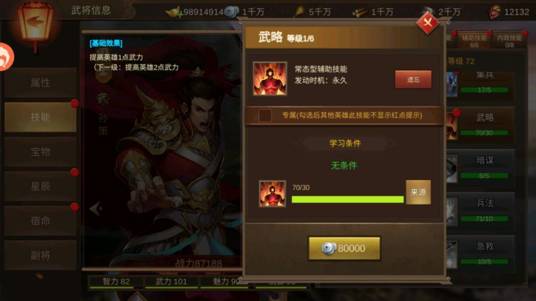 副将给主将提供加成,主要靠2个手段 副将技能伤害 · 影响1:副将主动技能等级,主动技能等级越高,技能伤害越高。 (副将主动技能等级-副将白身英雄技能等级总和)二合前副将自身英雄技能等级总和最高125,英雄可以学习5个技能,每个25级,则25*5=125 注意:副将主动技能伤害,仅仅和英雄技能有关,与辅助技能无任何关系,所以再次强调副将是不需要学习辅助技能的! · 影响2:副将携带宝物评分携带的宝