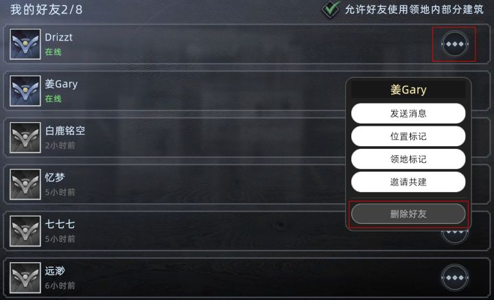 如果有遇到如下几个问题,可通过删除好友再添加的形式恢复正常:1、开启了权限,但好友却无法使用自家的部分建筑;2、无法定位好友位置和好友领地位置;3、好友在线却显示不在线,导致无法邀请进入副本。暂时只能辛苦大家这样手动操作下(PS:删除好友按钮在好友系统-对应好友右侧更多按钮处点开