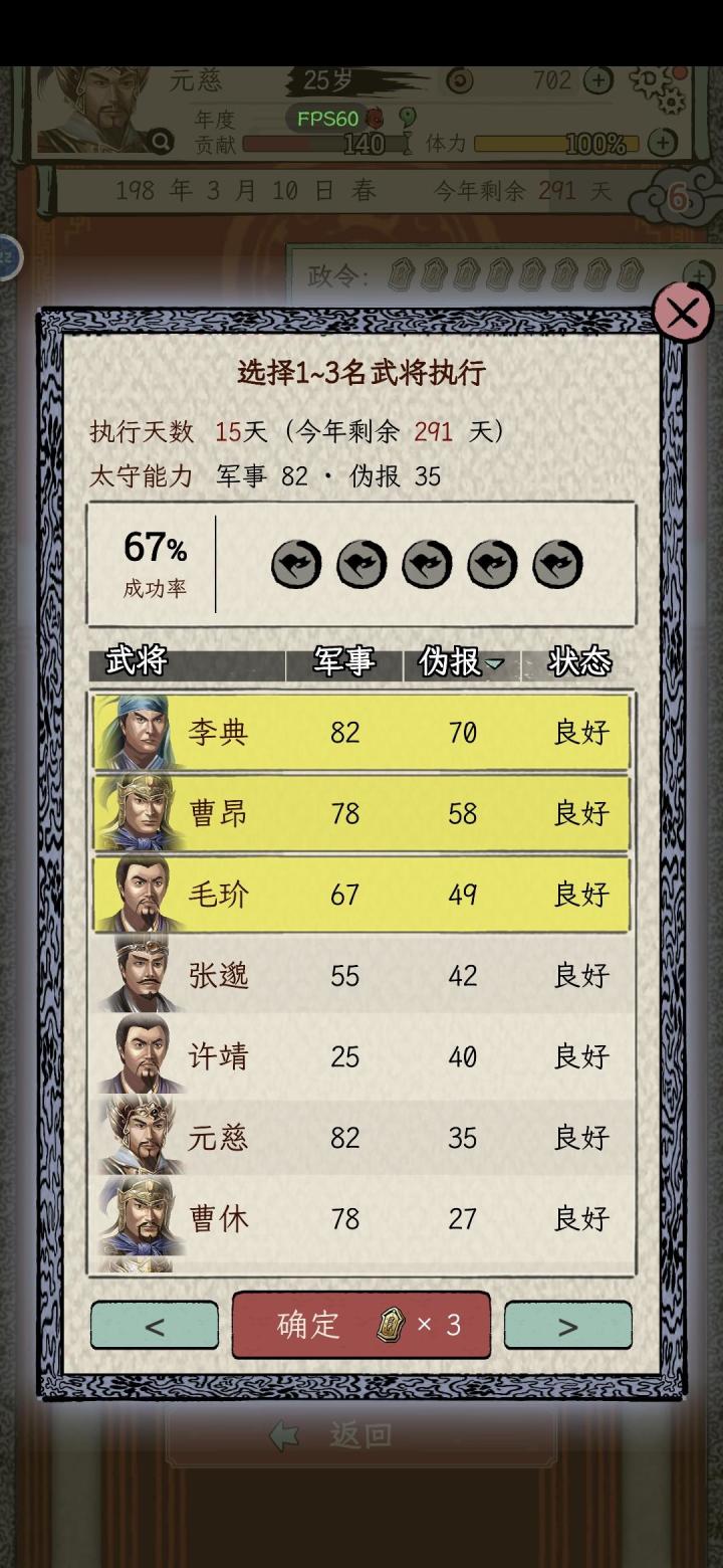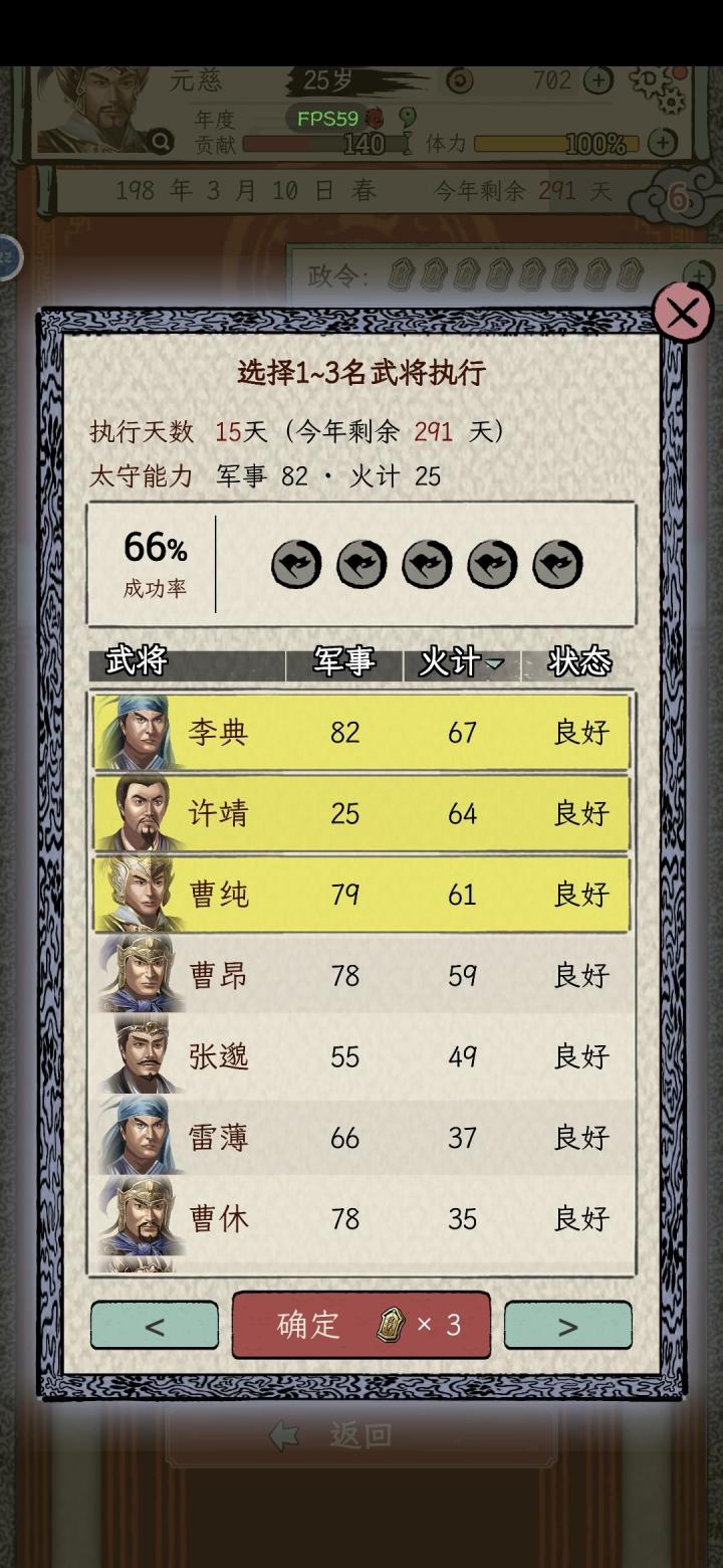 1.多跑酒商委托,城市尊崇,买东西便宜,和君主关系好,被封太守几率高。2.22岁,七品(升六品)被封汝南太守(二夏侯一个谯,一个许昌)3。给了曹昂,许静,雷波,3年拉了4个人,(张邈,李典,曹休曹屯—打刘备濮阳多一个令牌)4,发现政令成功率还是不高。不过应该能稳住,曹老板手下乙类好啦的人已经被我拉完了。