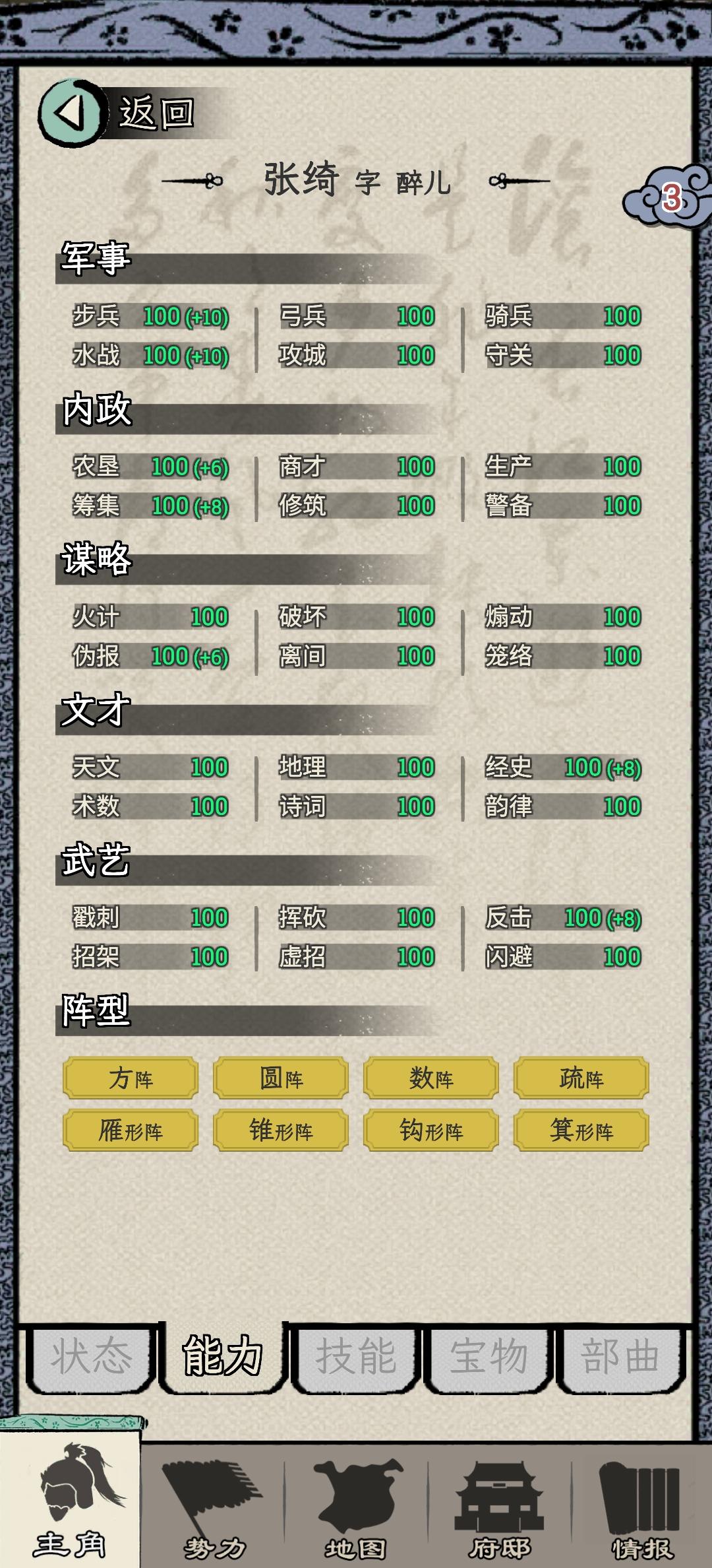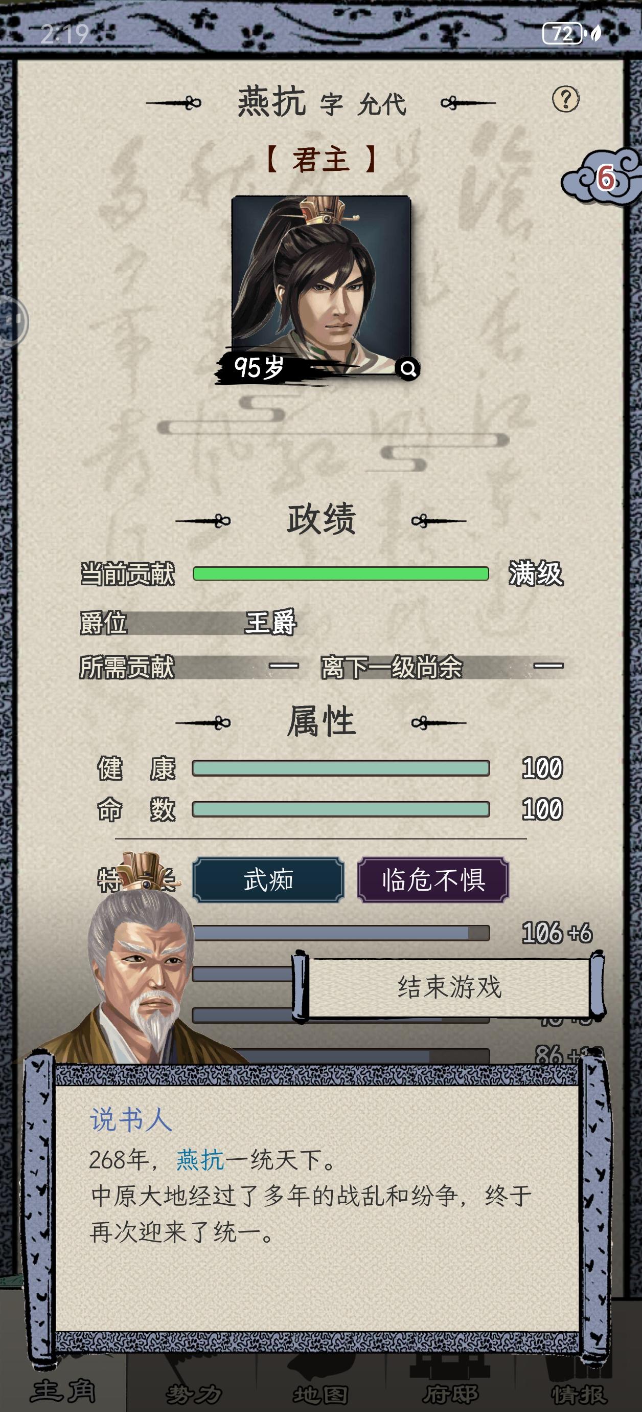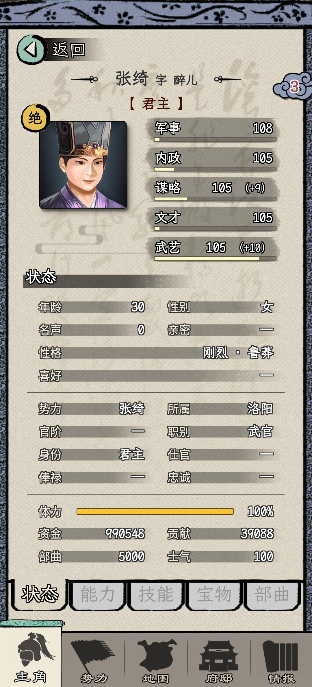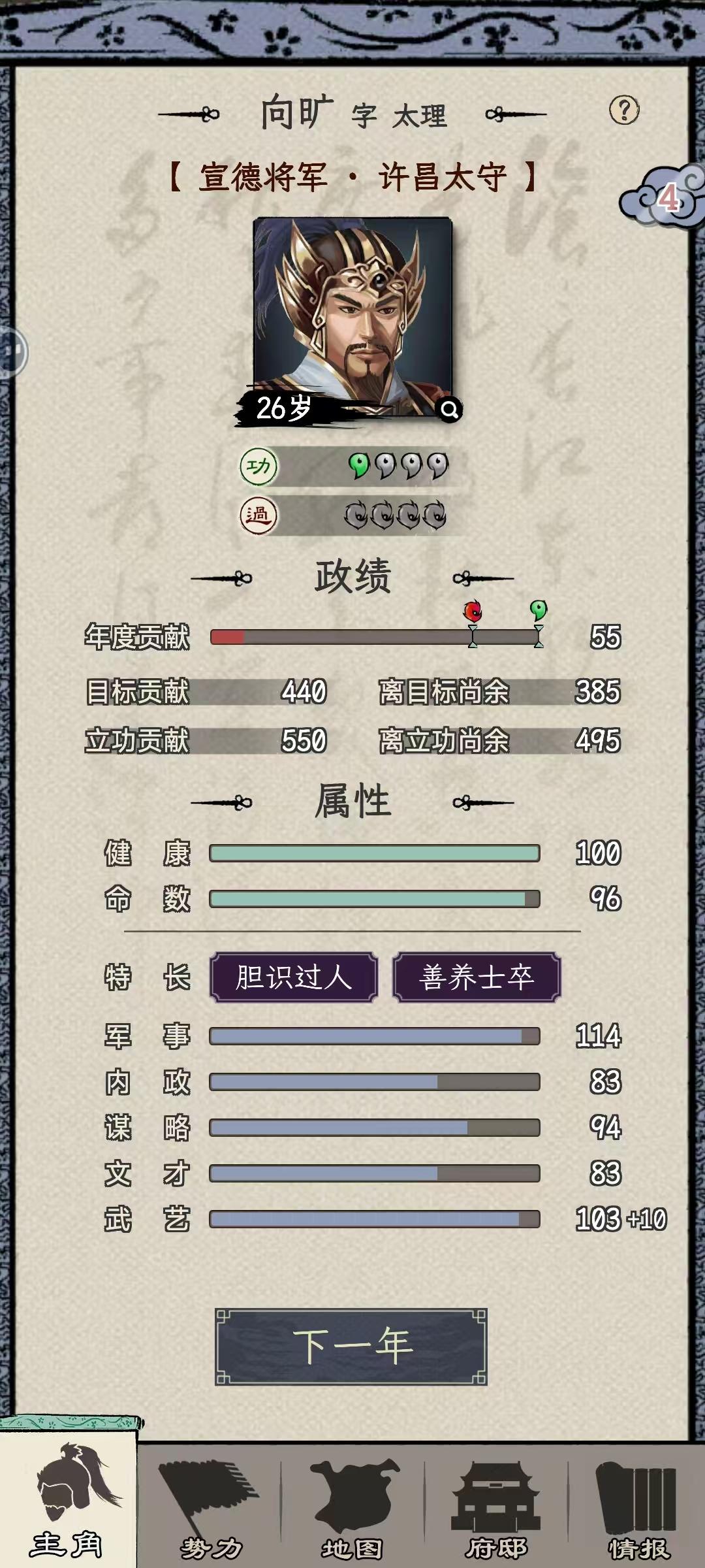 何进开局,第一次战争主动送人头。官升五品,第二次许昌大战拿下,直接给了太守,何进这人能处。太守干到一品马上谋反,自立为王,一秒都不能等,对不住了何大将军。前两年修生养息,发展内政,因为这座城市一分钱都没有。接下来就是年复一年的打天下过程,毫无难度。一统天下之前升到王爵,把基础五维属性升到105,所有单项属性升到100,所有技能学满,练出5000虎豹骑。75岁一统天下!