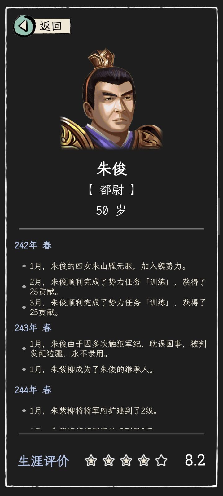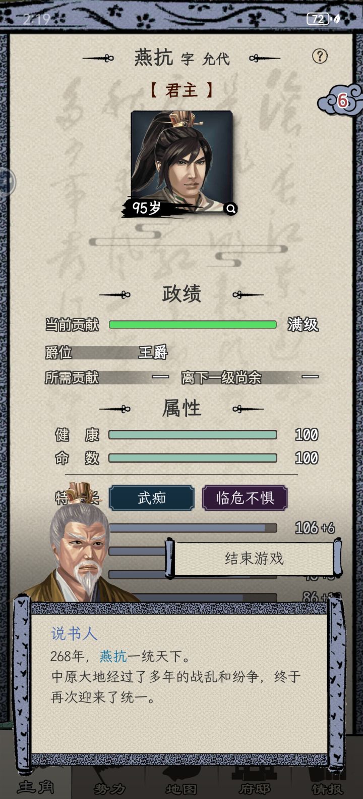 开局选的孔融势力,因为老大手底下除了我就一个王修,人不够升品后指标完不成会记过我就卡死在五品不升就搁那库库生娃,最后成功熬死王修和孔融我想着咋的也轮到我了结果传位给我二闺女了,行吧反正孩子数量够了升品也没啥压力。过程中北海隔几年就去挑衅平原一下,一开始对面十几个将都是吕布貂蝉夏侯渊夏侯惇这种我这边就仨人根本打不过,等我孩子够六个了这些基本也都熬死了最后打了几次给城磨秃噜皮了也终于算打过了,我闺女也