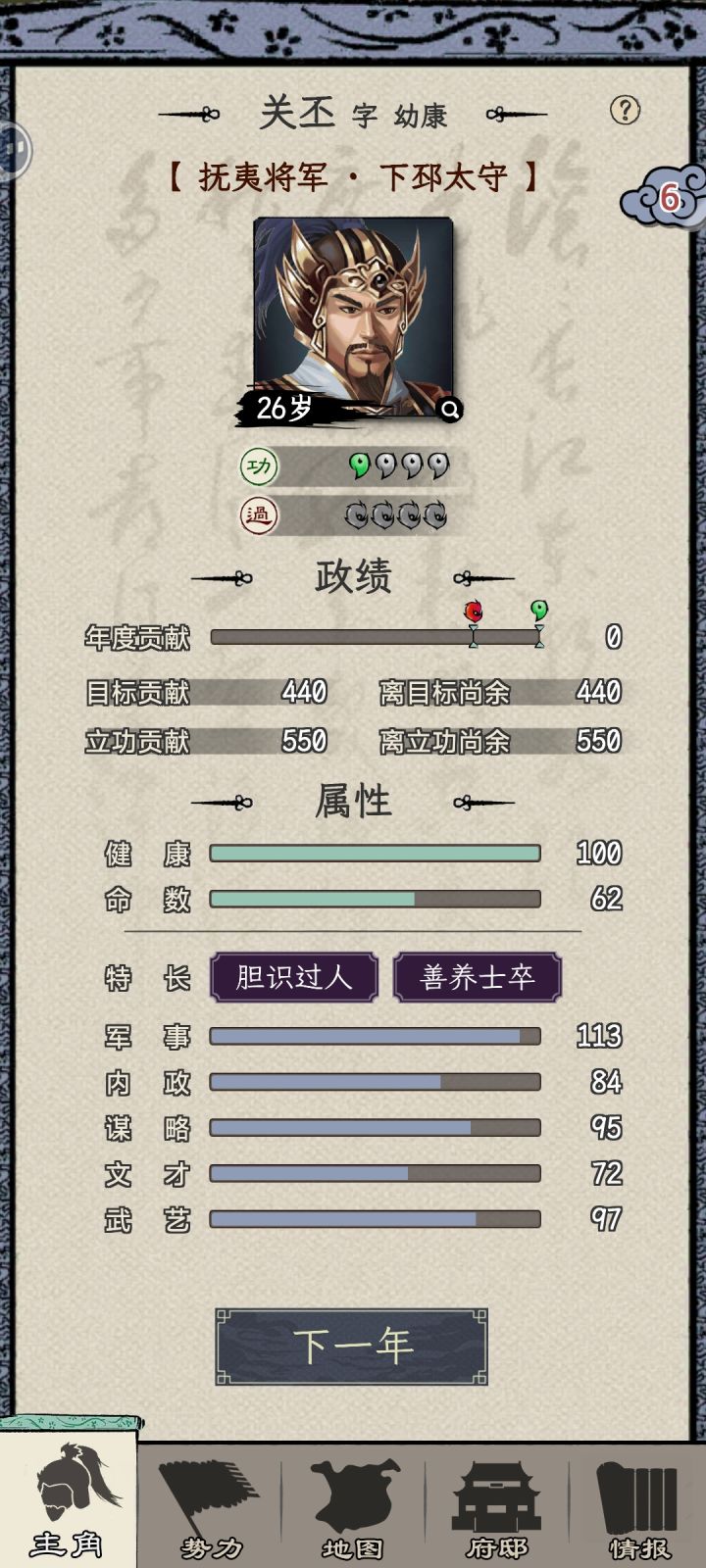第一次玩,选刘焉和最早的时间点,因为不是很熟练,玩了差不多几个小时,总算通关了。前期就是猛猛做任务,干到太守,感觉刚到五品官时候,属性不是很好(主要是像笼络,离间这些只能读书搞的属性不高),这时候当太守想把贡献搞搞高比不是太守时候的还要难(除非手里有“绝”的将领)。后面就要不断巡城读书(专搞内政,文采 谋略,军事方面的),如果到50就基本够用了(后面给我一个姜维,基本两个人就能完成任务),然后就