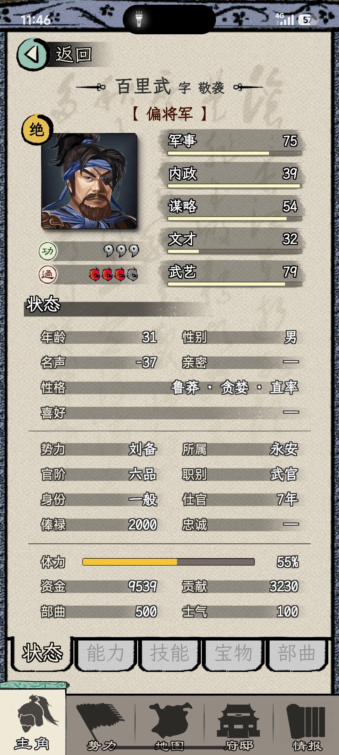 第一次玩,选刘焉和最早的时间点,因为不是很熟练,玩了差不多几个小时,总算通关了。前期就是猛猛做任务,干到太守,感觉刚到五品官时候,属性不是很好(主要是像笼络,离间这些只能读书搞的属性不高),这时候当太守想把贡献搞搞高比不是太守时候的还要难(除非手里有“绝”的将领)。后面就要不断巡城读书(专搞内政,文采 谋略,军事方面的),如果到50就基本够用了(后面给我一个姜维,基本两个人就能完成任务),然后就