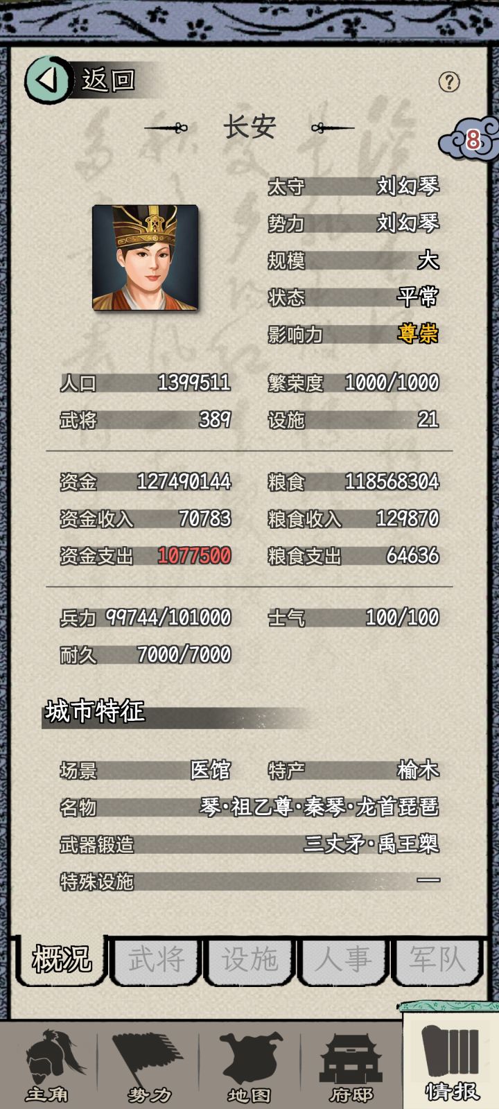 主城389个武将 你能想到的武将都在我这里 什么五虎上将 吕布诸葛亮都拿到了 还有几十个武将在别的城市当太守 要加起来的话 起码400多个武将 城市资金和城市粮食都通过一个城一个太守的方法刷到了1个亿
