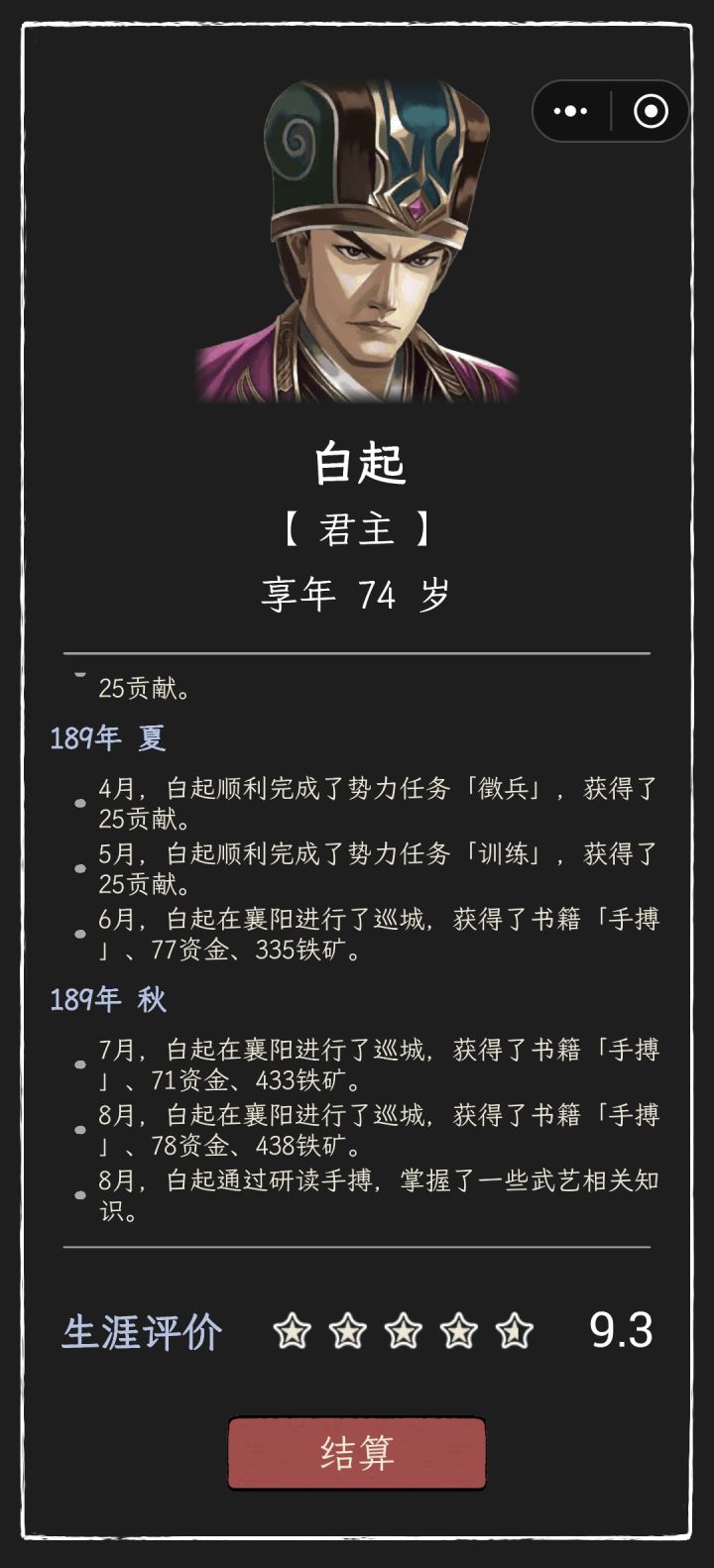 开局选的孔融势力,因为老大手底下除了我就一个王修,人不够升品后指标完不成会记过我就卡死在五品不升就搁那库库生娃,最后成功熬死王修和孔融我想着咋的也轮到我了结果传位给我二闺女了,行吧反正孩子数量够了升品也没啥压力。过程中北海隔几年就去挑衅平原一下,一开始对面十几个将都是吕布貂蝉夏侯渊夏侯惇这种我这边就仨人根本打不过,等我孩子够六个了这些基本也都熬死了最后打了几次给城磨秃噜皮了也终于算打过了,我闺女也