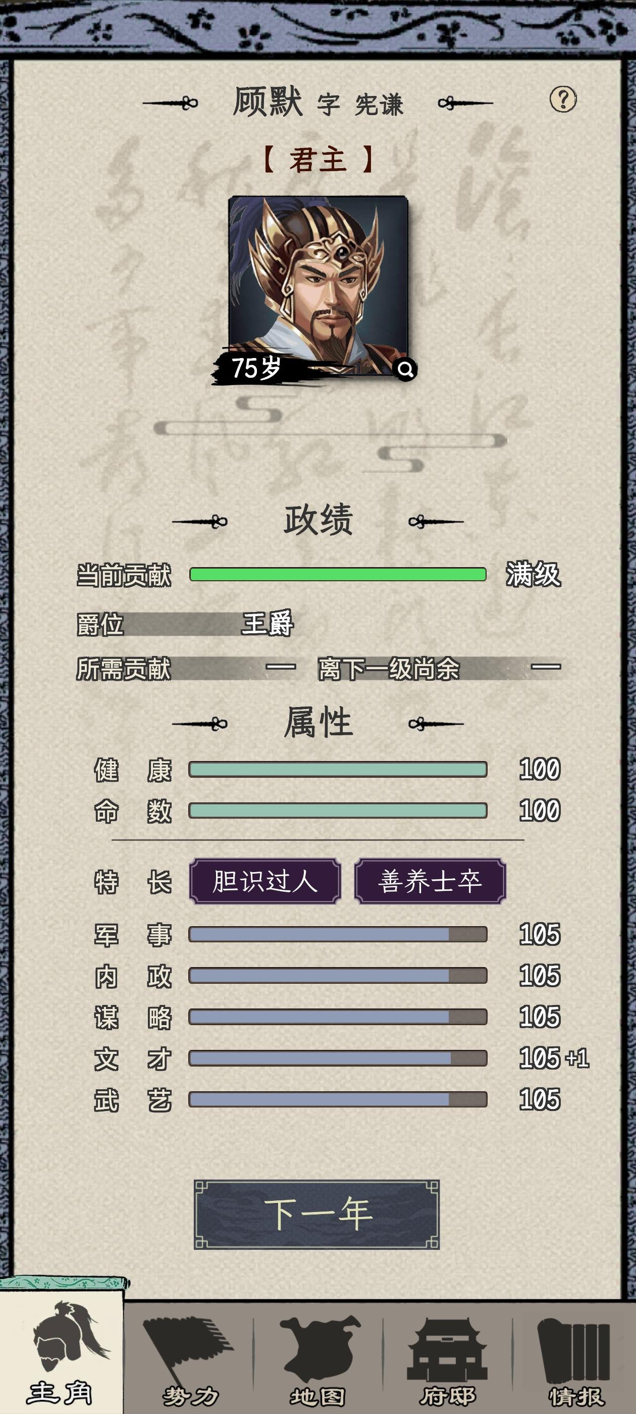 何进开局,第一次战争主动送人头。官升五品,第二次许昌大战拿下,直接给了太守,何进这人能处。太守干到一品马上谋反,自立为王,一秒都不能等,对不住了何大将军。前两年修生养息,发展内政,因为这座城市一分钱都没有。接下来就是年复一年的打天下过程,毫无难度。一统天下之前升到王爵,把基础五维属性升到105,所有单项属性升到100,所有技能学满,练出5000虎豹骑。75岁一统天下!