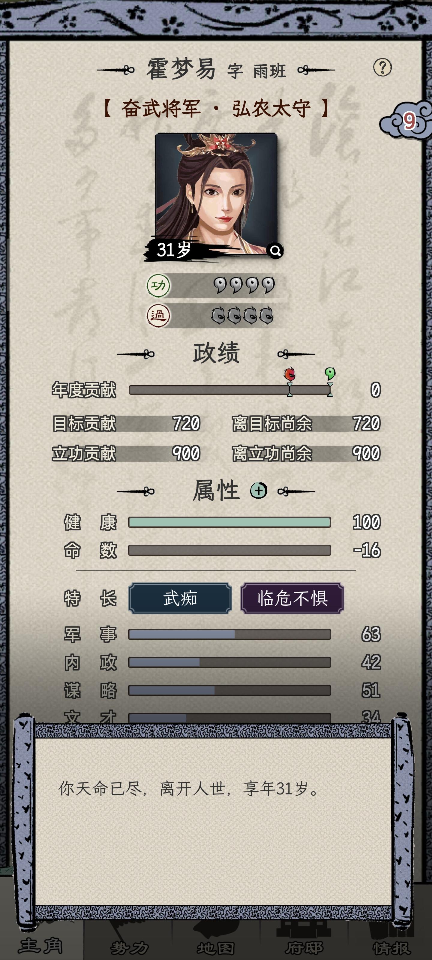 何进开局,第一次战争主动送人头。官升五品,第二次许昌大战拿下,直接给了太守,何进这人能处。太守干到一品马上谋反,自立为王,一秒都不能等,对不住了何大将军。前两年修生养息,发展内政,因为这座城市一分钱都没有。接下来就是年复一年的打天下过程,毫无难度。一统天下之前升到王爵,把基础五维属性升到105,所有单项属性升到100,所有技能学满,练出5000虎豹骑。75岁一统天下!