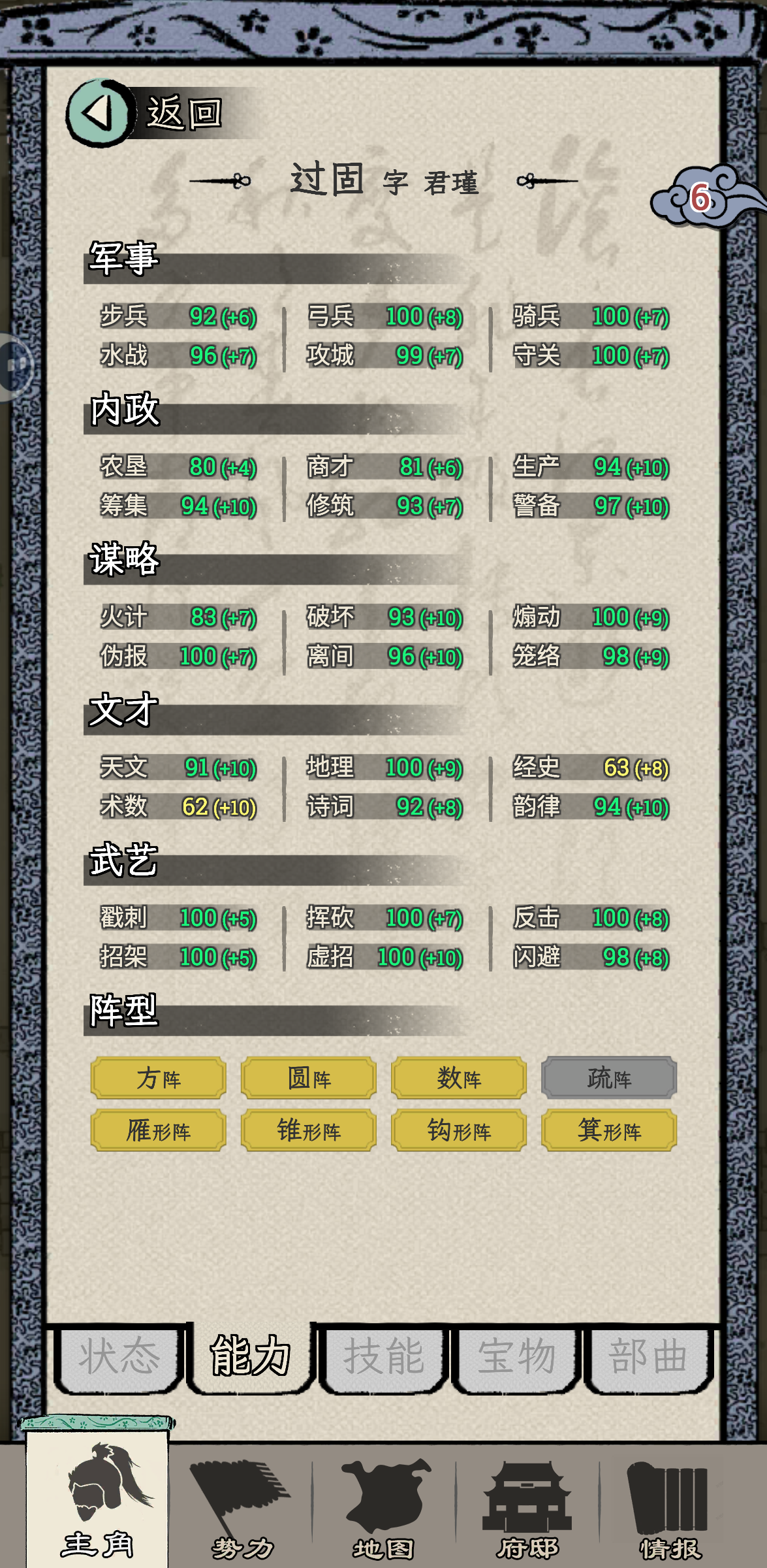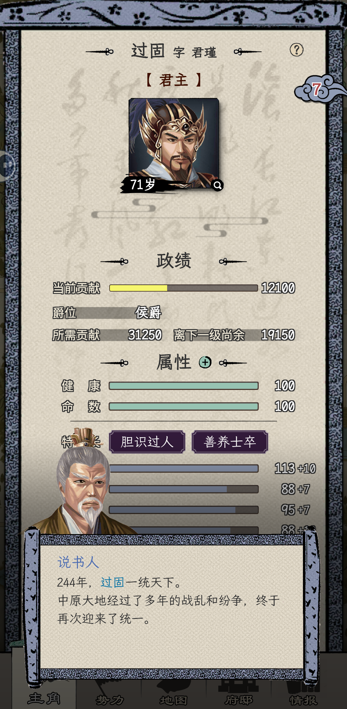 何进开局,第一次战争主动送人头。官升五品,第二次许昌大战拿下,直接给了太守,何进这人能处。太守干到一品马上谋反,自立为王,一秒都不能等,对不住了何大将军。前两年修生养息,发展内政,因为这座城市一分钱都没有。接下来就是年复一年的打天下过程,毫无难度。一统天下之前升到王爵,把基础五维属性升到105,所有单项属性升到100,所有技能学满,练出5000虎豹骑。75岁一统天下!