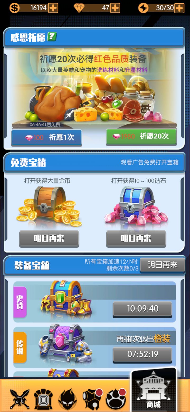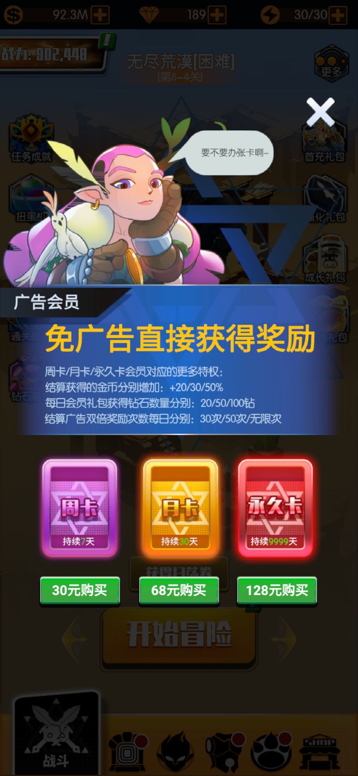 玩了几天,总的来说这是一款可玩性较高的一个游戏,不氪金也能玩得不错,肝帝们的首选。前期优先推荐玩弓箭手,虽然成长属性比战士低了些,但手长,也有翻滚无敌这一专属神技,前期可以做到无伤通关,让你更好的拿到资源。后期可以换狂战士,成长属性高一些,缺点是对装备要求较高,毕竟要贴身肉搏,站不住就没了伤害。每日里面的金币宝箱和砖石宝箱还是建议观看领一下,毕竟给的砖石和金币也挺多的,当然有条件可以买免广告卡,不过不推荐,广告十几秒,挂个后台一下子就过去了。