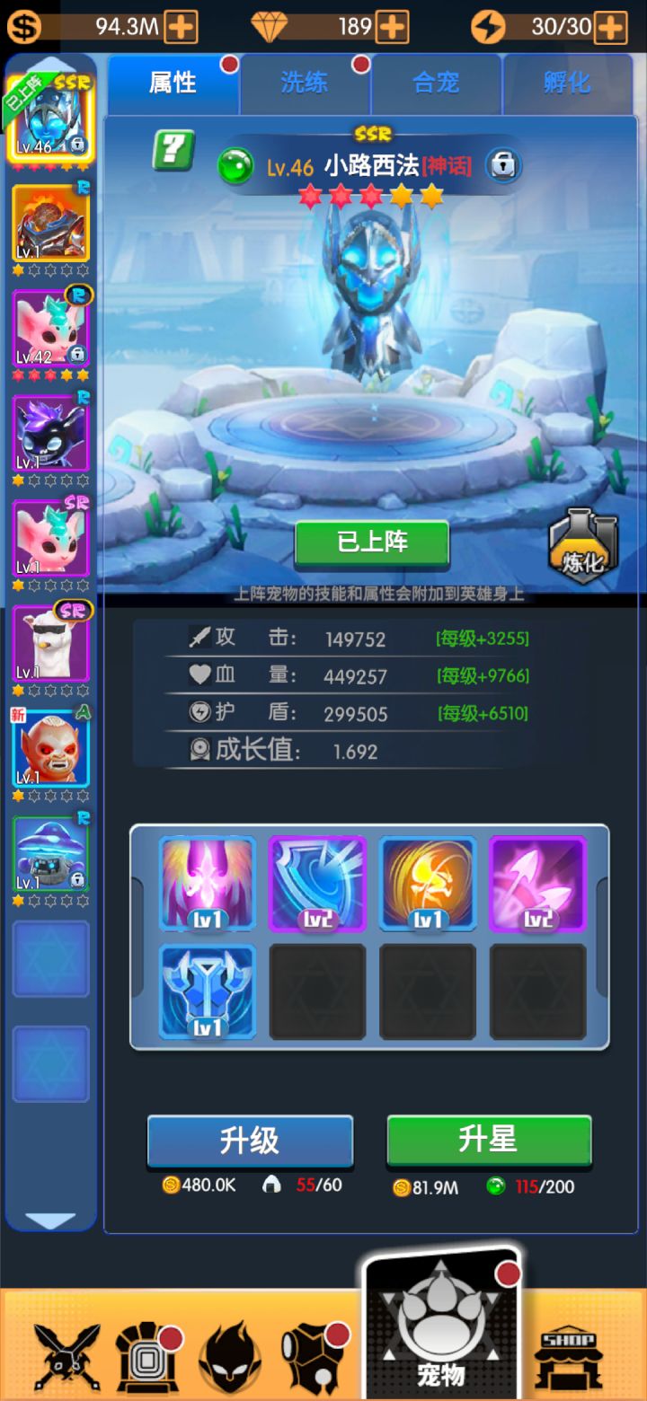 宠物篇宠物分为白,绿,蓝,紫,金,红六个级别其中红色初始最高为6技能现在版本宠物最高为8技能,只能通过合成来获取宠物合成规则为二合一,两个宠物技能数的平均值上下浮动2,比较考验欧皇属性宠物获取分为普通池子和高级池子高级池子最高获得红色宠物蛋,1000钻抽5次,个人感觉平均10次出一个红,然后每天能免费抽一次普通池子是5个宠物币抽5次,宠物币每天看广告和首次通关都能获得,最高可以过得紫色宠物蛋。前期搞个紫色4技能的凑合带着就行了,技能哪个好带哪个,没必要洗中期可以搞个红色5或者6技能的带着,技能洗个2级翻滚无敌,过图必备后期有资源的同学可以追梦一下8技能红个人感觉比较有用的技能是翻滚无敌,破阵,角色的专属技能