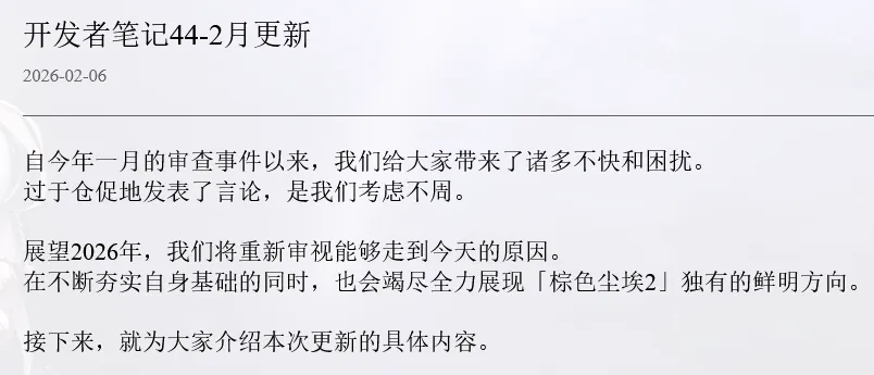 韩国NEOWIZ旗下策略角色扮演手游《棕色尘埃2》再迎重磅官方发声。游戏制作人李浚熙面向全体玩家正式致歉,就此前1月直播引发的内容和谐争议作出回应,并公布后续开发方向:将优化恋爱元素、梳理角色剧情线、重点提升玩家代入感,以修复社区信任、回归核心体验。作为以色彩属性策略战斗与高质感角色养成为特色的二次元RPG,《棕色尘埃2》此前因1月直播中公布角色外观和谐、剧情互动删减等调整,引发玩家大规模不满,