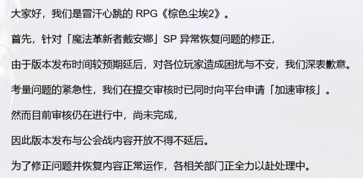 大的来啦家人们!由韩国NEOWIZ公司开发,特色为颜色因素的角色扮演游戏《棕色尘埃2》又又又因为卡审核而延迟了事情是这样的,起因是游戏里有个角色有点问题(角色为魔法革新者戴安娜,存在问题为SP异常恢复),官方觉得它会影响会战平衡,结果修修补补完了提交审核,到现在还没过。官方发公告说当时就觉得这事儿挺急的,还专门向平台申请了加速审核,但没用,还是卡在那儿。这下好了,部分内容没法按时开,很多安排都
