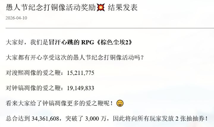 🔨 《棕色尘埃2》愚人节铜像活动数据公开,玩家集体敲打制作人 由韩国NEOWIZ公司开发,特色为颜色因素的角色扮演游戏《棕色尘埃2》近日公布愚人节纪念敲铜像活动结果,玩家对开发团队铜像的敲击数据引发讨论 在愚人节期间游戏内设置了制作人李浚熙与金钟镐的铜像供玩家敲打,官方数据显示,玩家对李浚熙铜像的敲击次数为15,211,775次,对金钟镐铜像的敲击次数为19,149,833次,总计34,36