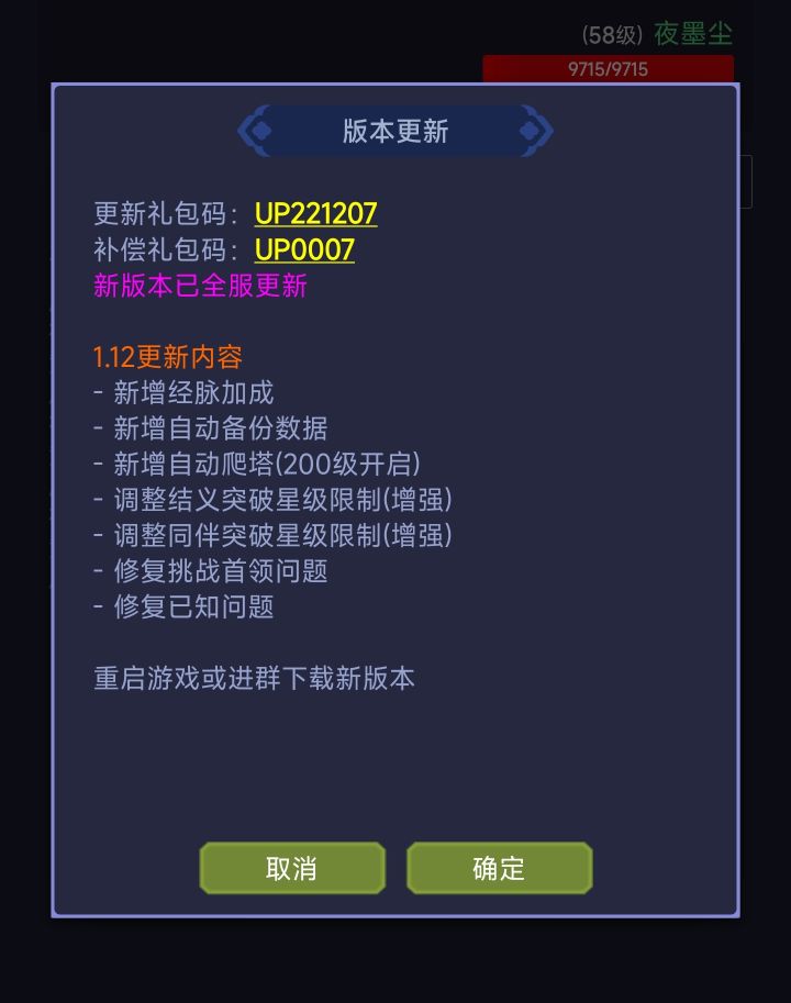 更新礼包码:UP221207本次更新为强制更新,需要Tap完成更新后方可进入游戏,感谢支持!1.12更新内容- 新增经脉加成- 新增自动备份数据- 新增自动爬塔(200级开启)- 调整结义突破星级限制(增强)- 调整同伴突破星级限制(增强)- 修复挑战首领问题- 修复已知问题
