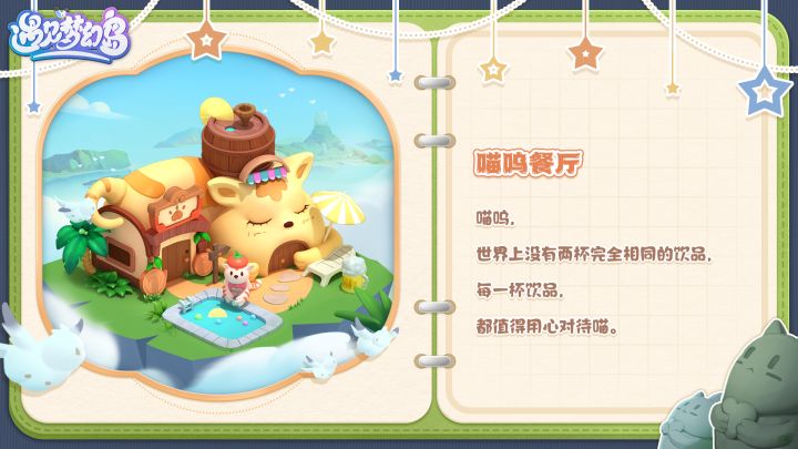 喵呜喵呜,是谁的肚子在咕咕叫啦 (*^▽^*)温馨提示:5月9日「遇见测试」开启!上岛倒计时3天!遇见,你的口袋岛屿,开启环球旅行!其他更多测试相关资讯,请留意咕哒的消息捏~咕哒咕哒,国王大人,梦幻岛居住指南又来啦~今天,就让咕哒՞•ᴥ•՞ 为国王介绍一下岛上客流量最多的建筑故事吧✨ 喵呜餐厅喵呜世界上没有两杯完全相同的饮品每一杯饮品都值得用心对待喵^ↀᴥↀ^对啦,国王最喜欢喝的