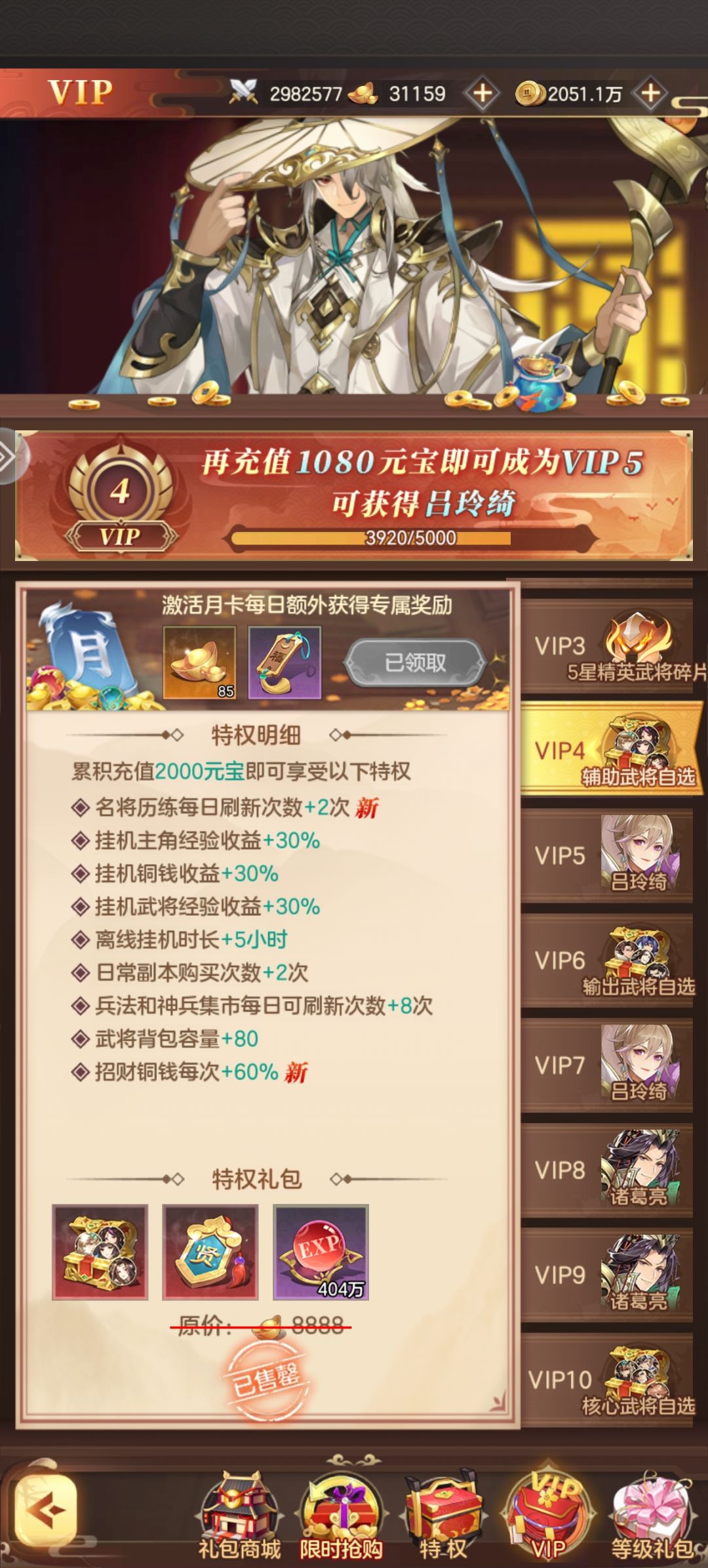 1.招募 第一天肯定拉满,尽可能提升战力 2.快速作战 每天必须拉满提升等级 3.商店 先说随机的元宝买名将册和招贤令,金币买进阶丹四星碎片竞技场挑战令 武将神兵不管元宝还是其他都要买 接下来每天固定的商城名将册300元宝招贤令(有能力把600的也买了) 每日的进阶丹也必买,后面很缺的 4.每日副本 次数拉满满满切记前期资源第一战力第二 5.限购礼包元宝买的(具体礼包叫啥记不太清了说声抱歉) 里面