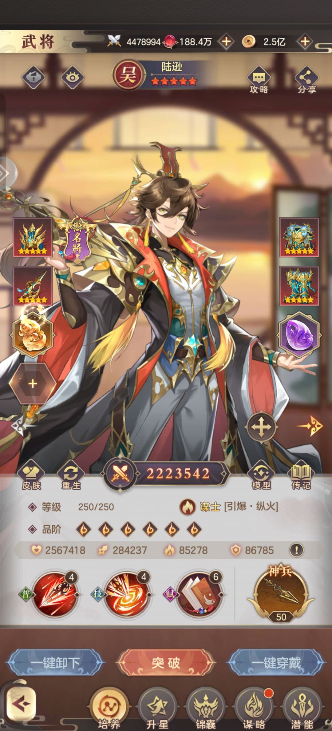 魂石、玉佩、兵法等搭配我以截图的方式放在文章后面,可供参考,具体还是因各个区服的对手而异。 中后期二人转基本成型,需要做的就是把袁绍的硬件与细节准备好,例如天命装备、天命赋能、兵法等等。 此外,袁绍的觉醒皮肤可以说是这个游戏里含金量最高的皮肤,配合花木兰、甄姬等回怒武将基本很少被控,甚至不会被上官婉儿的反制影响。 一、袁绍基础属性(三维) 袁绍是一个多动的武将,要想多动就需打出伤害,那就需要堆三