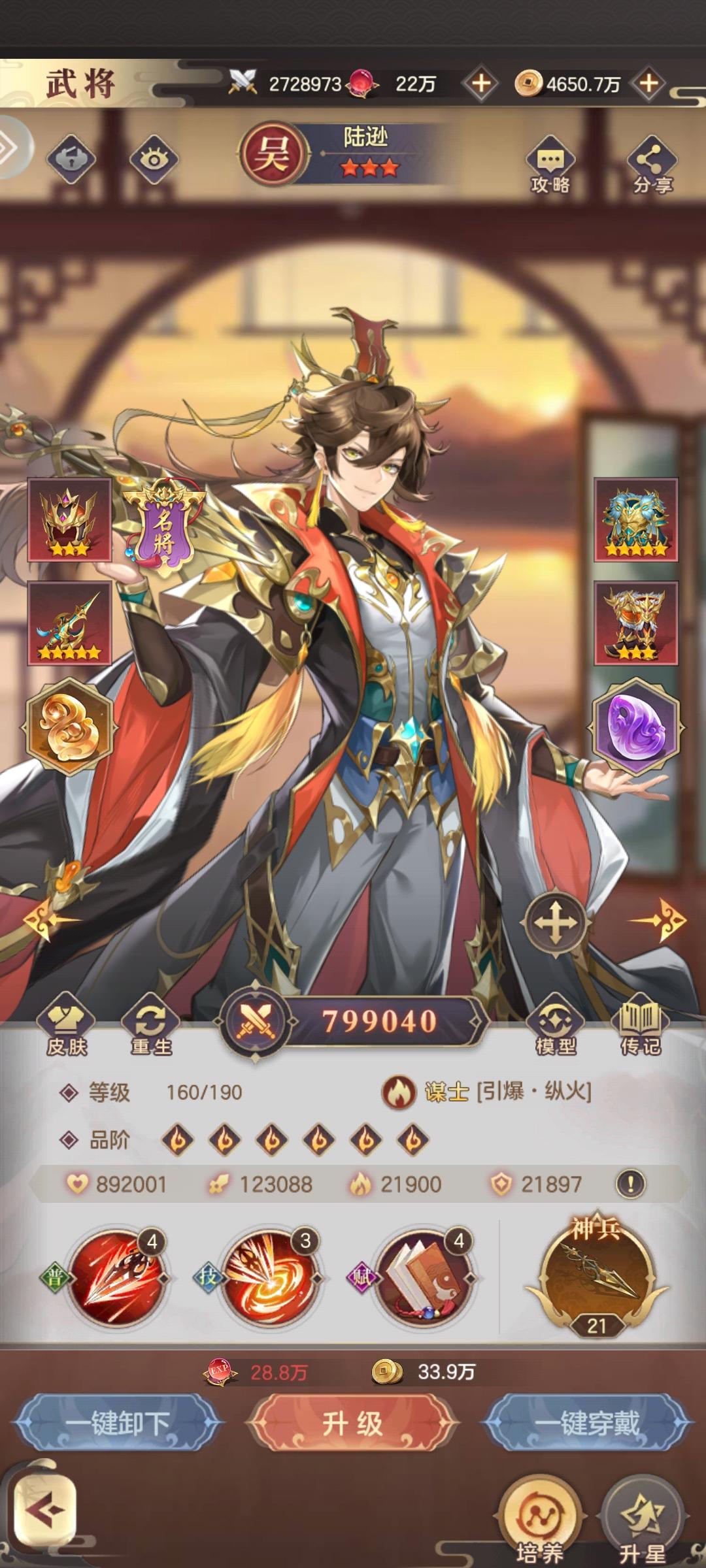 二者得其一便可得天下!这期学长给大家带来陆逊攻略。#幻想名将录 #游戏攻略 #游戏日常 虎帐谈兵按六韬,安排香饵钓鲸鳌。三分自是多英俊,又显江南陆逊高。一、锦囊玉佩(不是绝对的大家可以自行搭配)玉佩基础属性:生命,生命玉佩优先洗出:神敕,净化。剩下的五个位置可以任意搭用。剩下五个位置:再生,盎然,止战,驱散,精准,灭魂,法抗,铁甲,波动,等等……(靠学弟学妹们自己科研创新