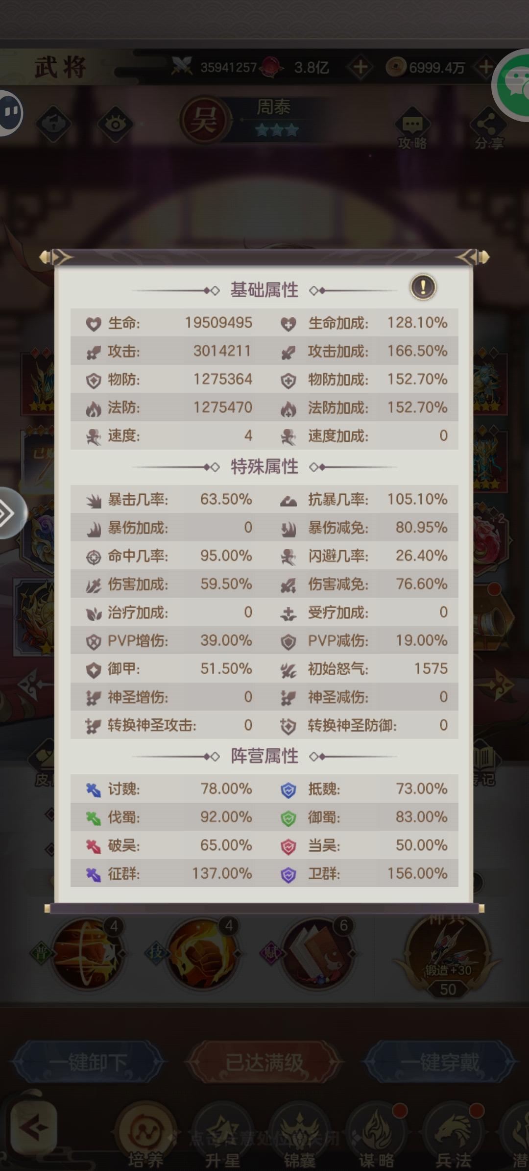 作为一个普通的零氪玩家,终于也是把周泰养到2500万了。目前的锦囊,兵法和魂石还不太好(不出货实在太难受了)如果有新玩家入坑想玩周泰我推荐兵法:抵抗,破敌,炽烈,狂暴,锁定,无尽,金刚,坚城锦囊搭配玉佩:净化(我看谁不洗净化),神赦,灭魂,其余位置小将军们可以自己搭配,个人推荐复活,爆追谋略:粉碎打击潜能:刚开服第一个潜能槽可以选无懈可击,净化刷出来就可以都选第一个了魂石:谨慎(生命,防