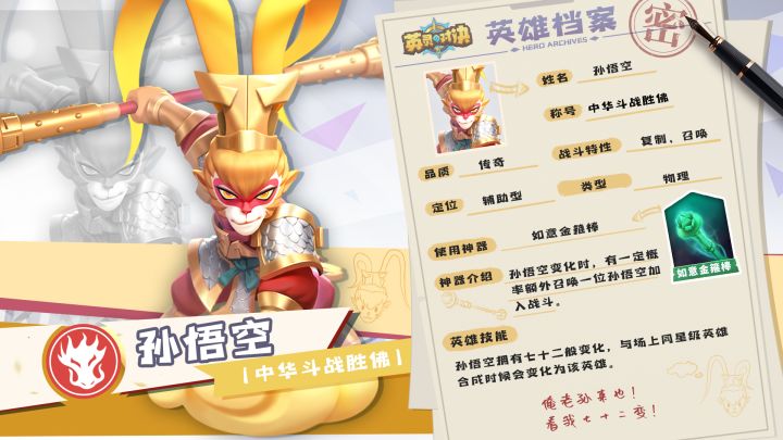 【英雄介绍】相传悟空自从石头崩出,通过学艺,精通七十二般变化,于是大闹天宫,被如来压在五行山下幸得观音点化,随三藏一同前往西天取经,他是一个正义勇敢、敢作敢当、勇于牺牲的人,历经九九八十一难,最终成为神仙被封为斗战胜佛。在英灵战场里他是一个善恶分明、机智善战的孙悟空。【英雄定位】孙悟空的定位是辅助英雄,伤害并不算高,局内强化和升星都会提升英雄伤害。因此在对战中的强化优先级相比于其他主力输出英
