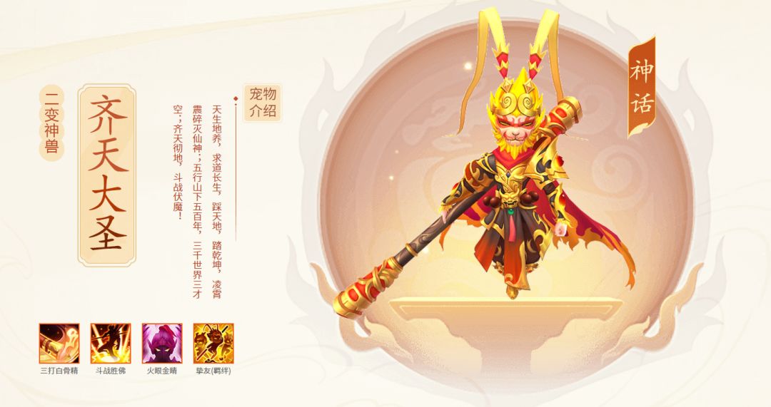 本为女娲补天石吸收日月精气之后的化身,化成生灵后坐镇花果山水帘洞结交各路妖魔誉为美猴王。 拜菩提为师习得七十二变、筋斗云之法,入龙宫获至宝定海神针,下地府改生死簿得长生不老,上天宫搅得天翻地覆,进丹炉炼得火眼金睛,是谓齐天大圣——孙悟空。 关于齐天大圣: 游戏中的大圣是由美猴王进阶而来,大圣作为一个实战性非常强的神宠,带的技能也是非常有考究的,这能决定你跟战力差距不大的玩家PK结果!对于进阶成齐天