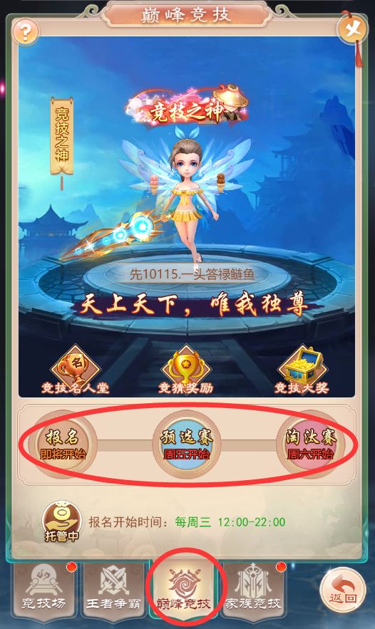 你是否幻想过站在众仙之巅剑指苍穹?你是否幻想过天地悠悠,唯吾独尊?如果你想名满天下,洒一腔热血书恣游扬荡,那么快来参加【巅峰竞技】跨服活动吧! 开启条件:角色达到5转1重 活动类型:跨服活动 活动阶段:报名——预选赛——淘汰赛 活动时间:报名时间:周三12:00-22:00预选赛时间:周五晚上19:30—19:40淘汰赛时间:周六晚上19:30 活动说明: 1.在报名时间内,成功报名的玩家