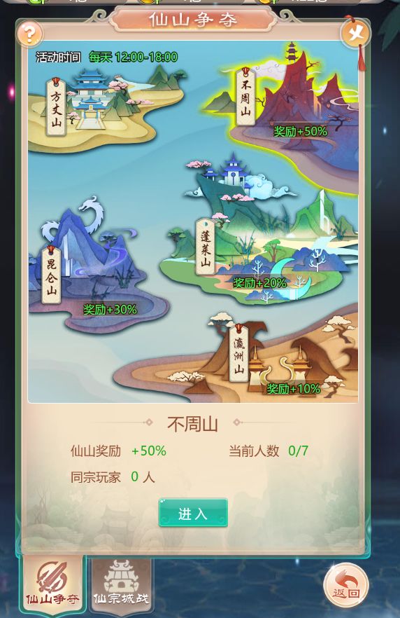 在修真界有一个流传下来的传说,传说世上有五大仙山,分别为:不周山、蓬莱、瀛洲、昆仑山和方丈山。而每当仙山现世时,凡能进入仙山的修真者皆能获得不菲收获。故每每在仙山现世之时,各大仙门便展开了争夺仙山控制权的大战!只有实力非凡的宗门才能在这场争夺中获得最高收益! 活动时间:每天12:00~18:00 活动类型:跨服活动 参加条件:玩家等级≥2转1重且加入宗门 活动说明: 1.活动开启后,每座仙