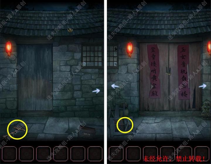 攻略作者:迷失攻略组-路人A未经许可,禁止转载,侵权必究!💡更多图文+视频攻略可搜公众号🔎迷失攻略组(也是第一时间放攻略的地方(^U^)ノ点击跳转:丨丨第一章攻略1.拾取【木棍】和【齿耙】,组合道具获得【长柄耙】。1.12.用【长柄耙】取下屋顶的纸鹤,将纸鹤展开的【纸条】贴在窗户上得到密码(密码随机),打开木盒获得【钥匙】。2.13.用【钥匙】打开侧门,拾取【把手】、【火柴】、【毛
